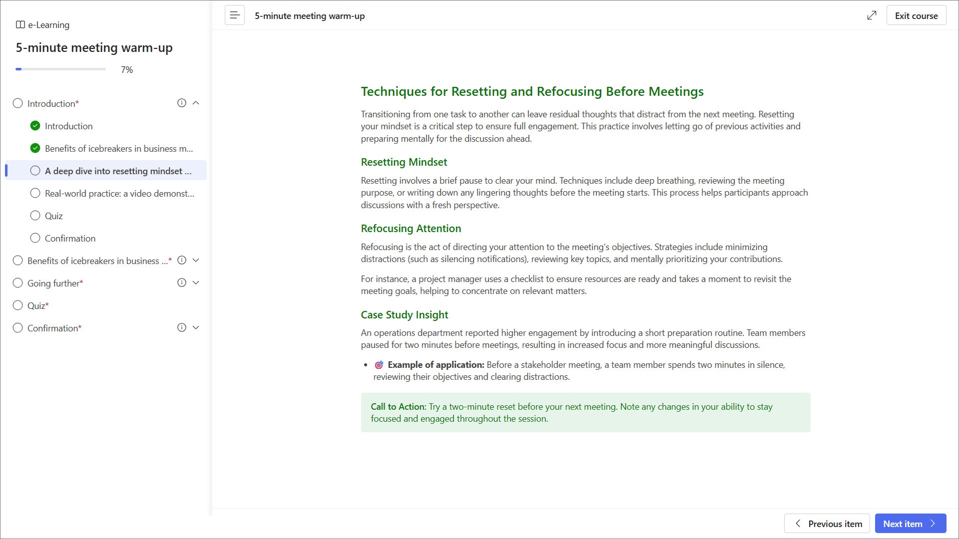 Learners can navigate available (unlocked) items in a course by selecting Previous item and Next item in the footer of the Learn365 player, or go to another learning item directly from the course syllabus.