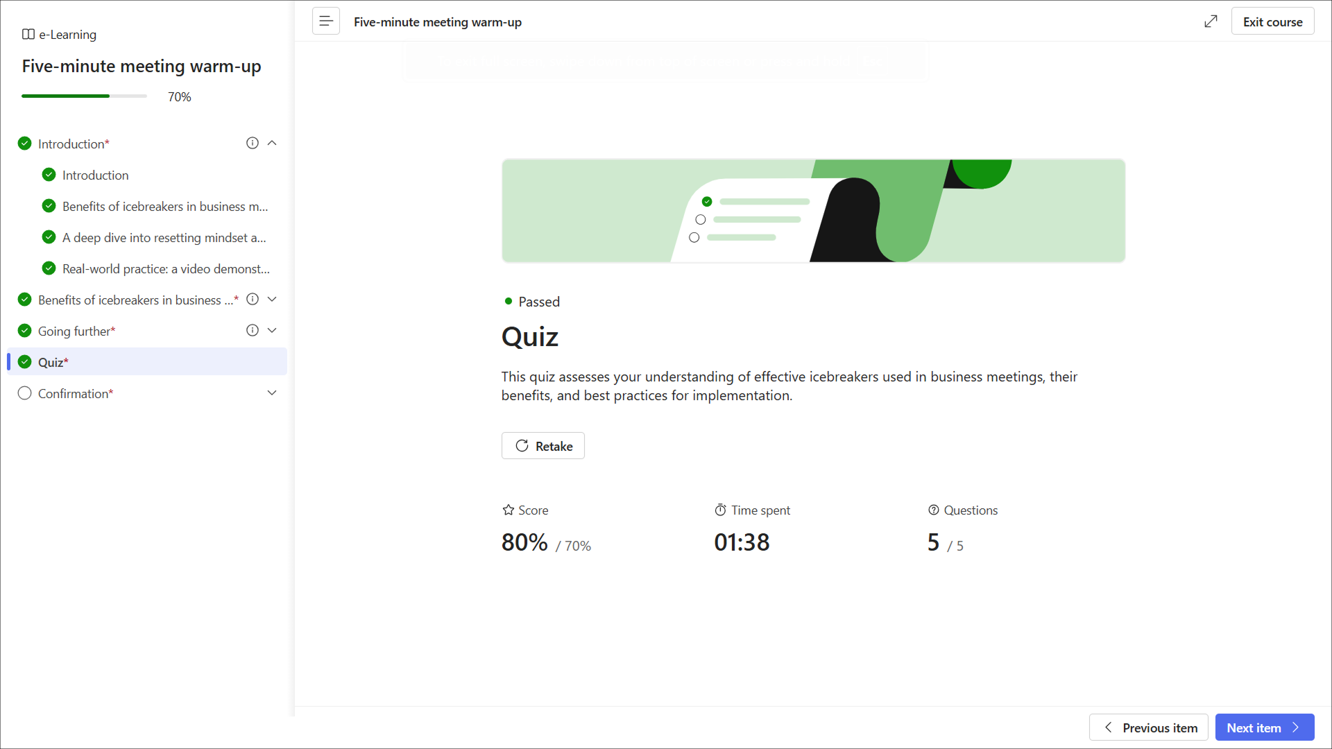 Learners can review the completed course items or exit the course to return to the course home page, where they can review or retake the course. For information about how learners can review course content, see this article.
