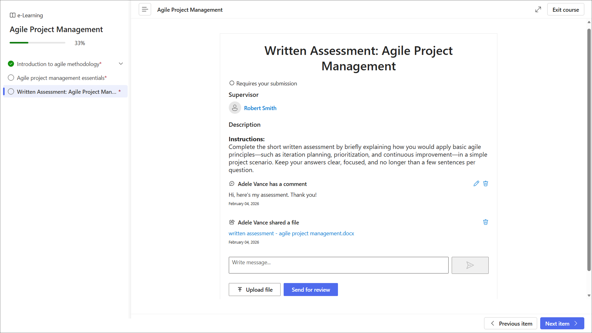 An assessment must be completed outside Learn365, and then submitted for a supervisor's review via the assessment's page in the Learn365 player. Here, learners can add and view supervisors' comments about the assessment, as well as upload any required files to support their assessment submission.