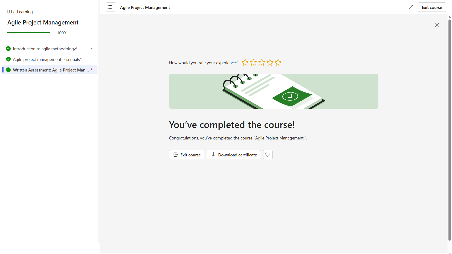 When a learner completes the last learning item required for course completion, the course status changes to Completed and learners see a congratulatory message. Here, they can rate the course by selecting a star rating or mark it as a favorite by selecting the heart icon. Rating a course doesn't affect the course status. Learners can also rate the course on the course home page.