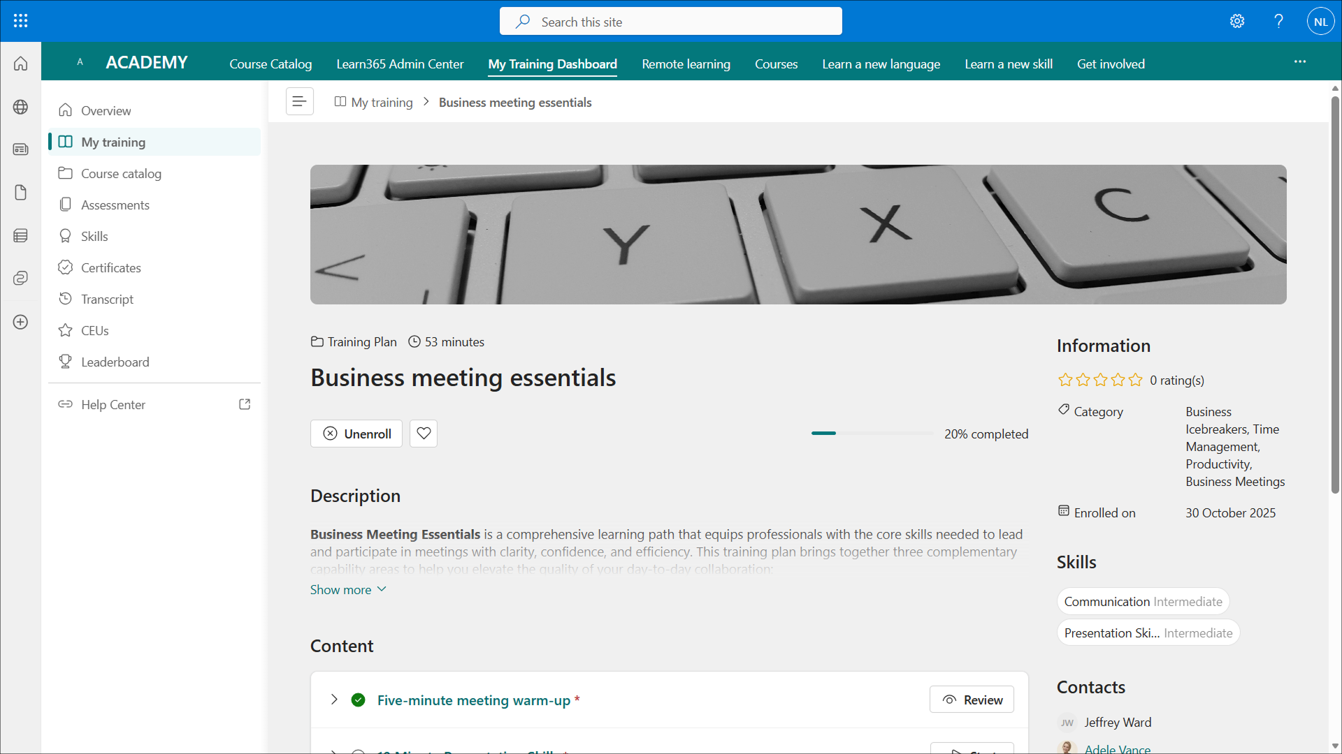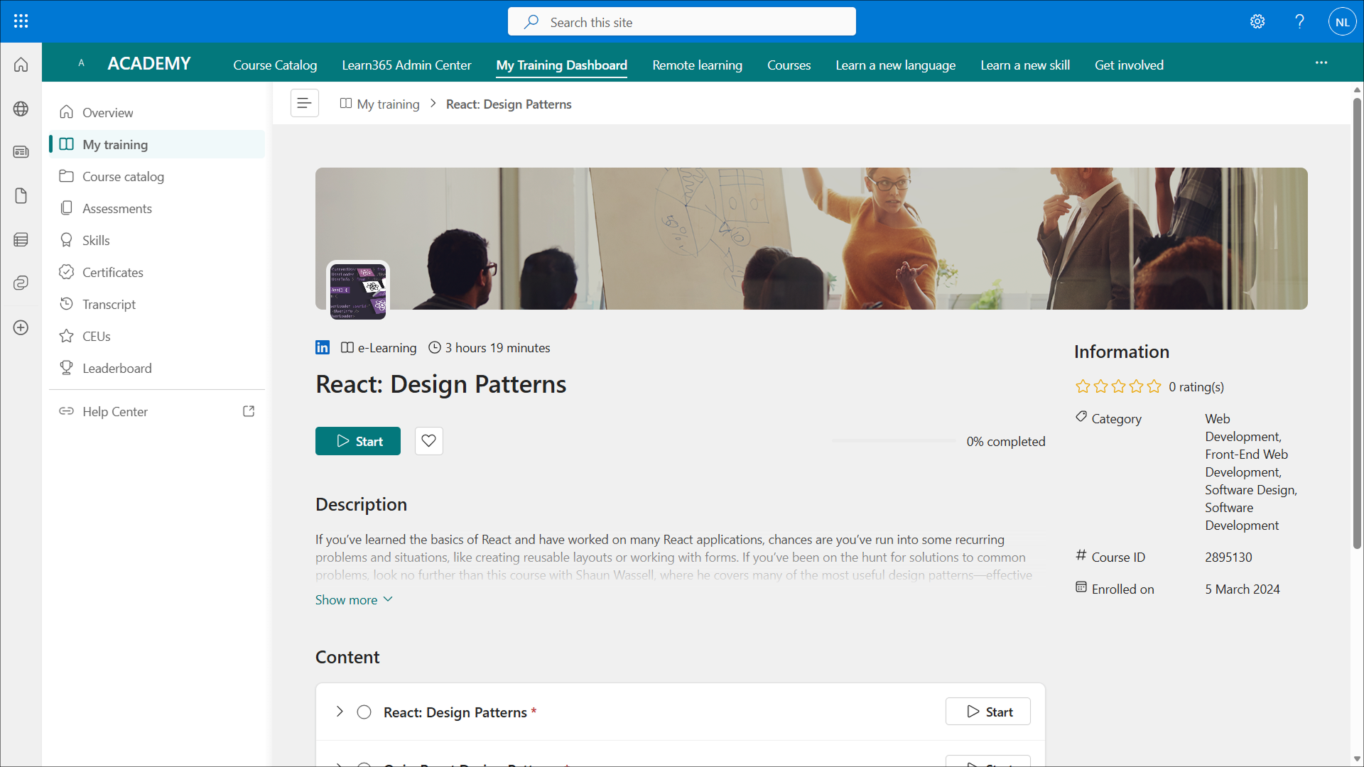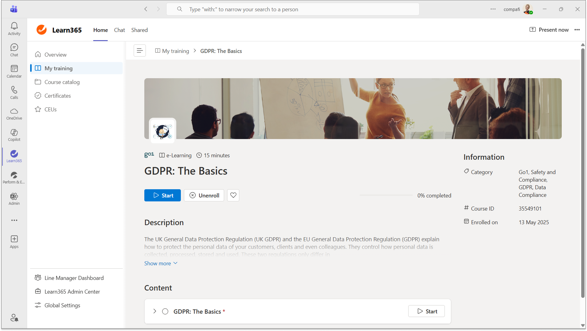 Learners are redirected to the Learn365 player, which opens on the first available learning item of the course. The course syllabus is displayed in the left navigation. For more information about the My training section in My Training Dashboard, see this article.