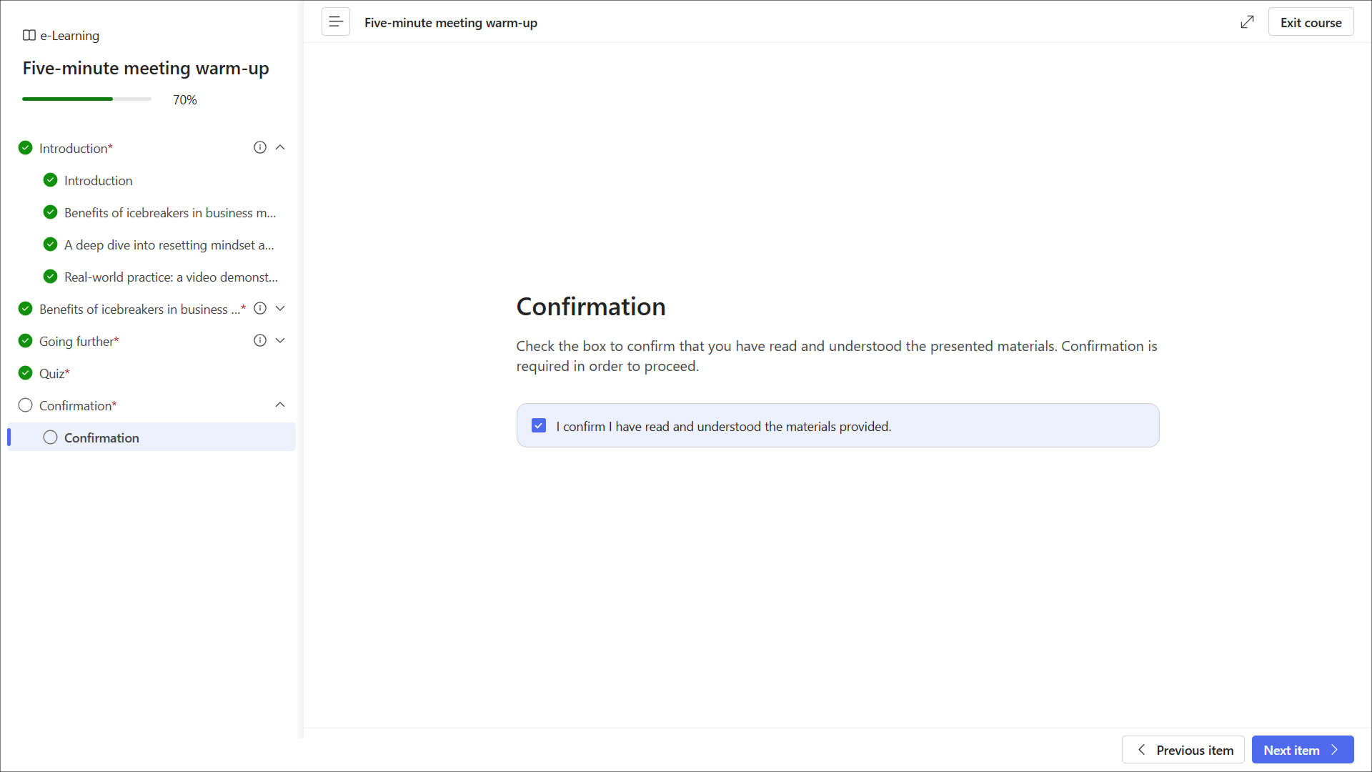 Learning modules might contain confirmation messages. A confirmation at the end of a learning item prevents learners from completing it, and the entire learning module, without first confirming they've read and understood all the content presented to them in the learning module.