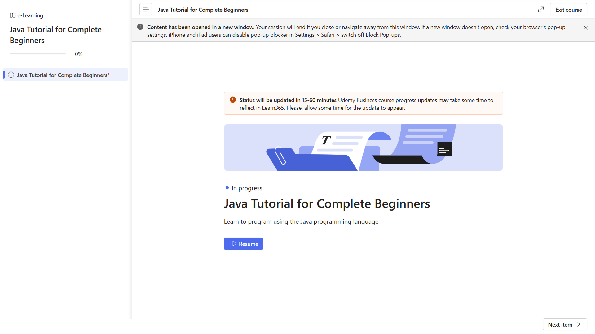 4. Select the course and go through the learning modules on Udemy Business. If a learner leaves the course before completing it, their course progress will be saved. It might take 15-60 minutes for Learn365 to reflect the course progress on My Training Dashboard > course page and inside the Learn365 player.