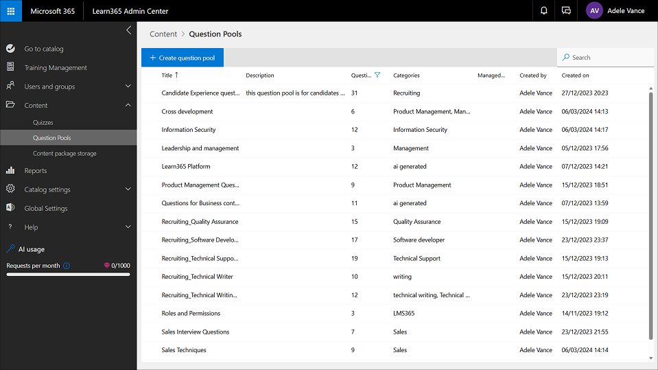 1. In the Learn365 Admin Center, go to Content > Question Pools.