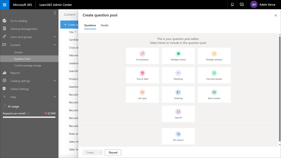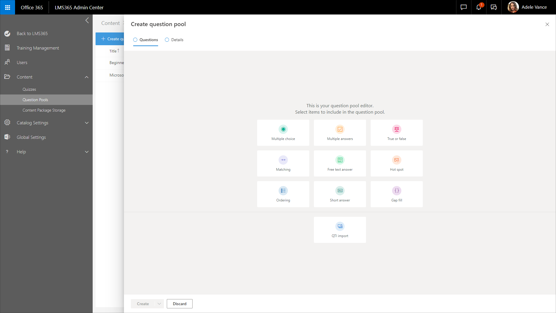 5. Select Create to save the question pool or Create and close. Otherwise, select Discard and confirm.