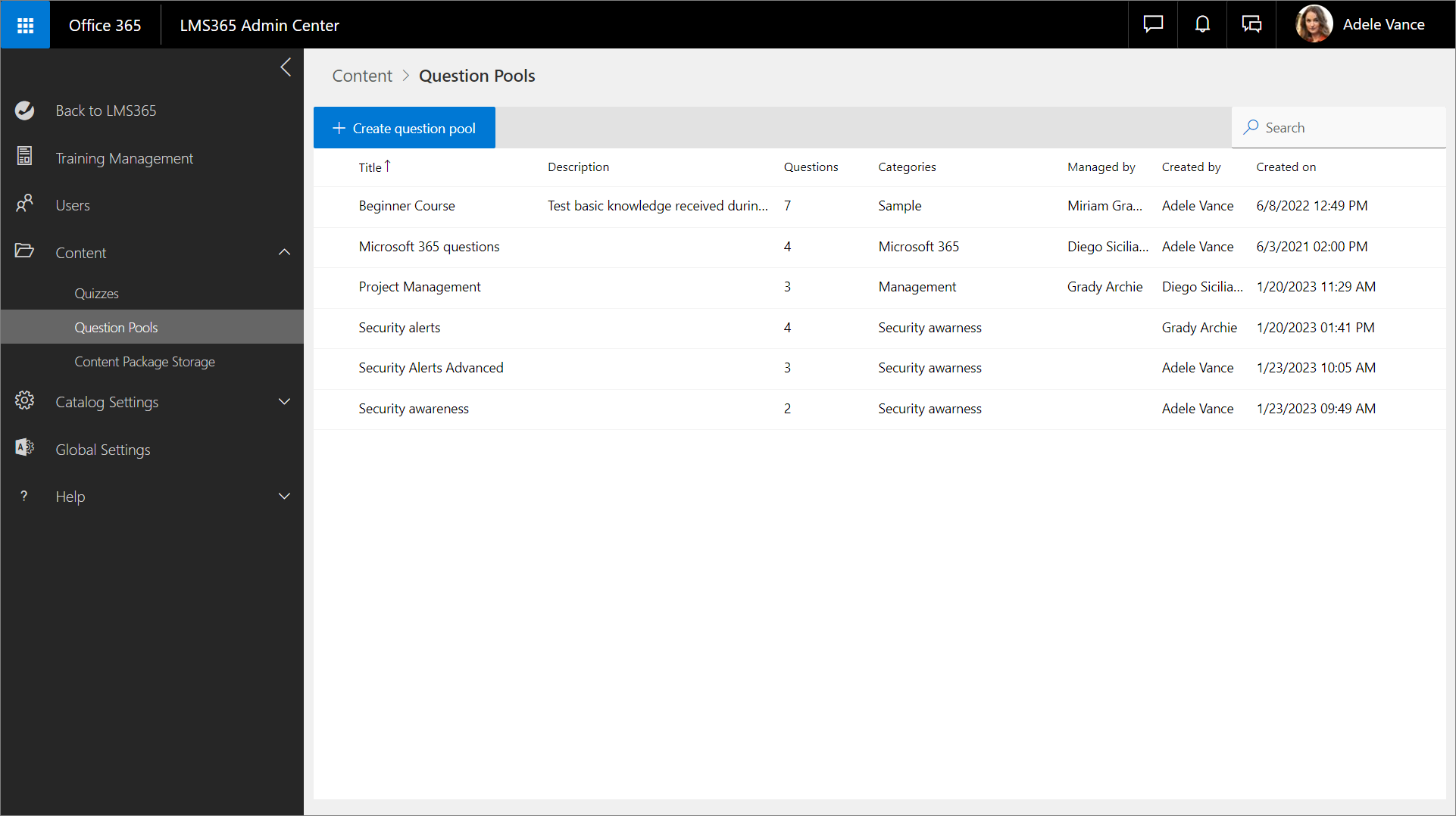 The created question pool will be added to the list on the Question pools page and will be available in all course catalogs on this tenant. The person who created the question pool is specified in the Created by column on the Question pools page.