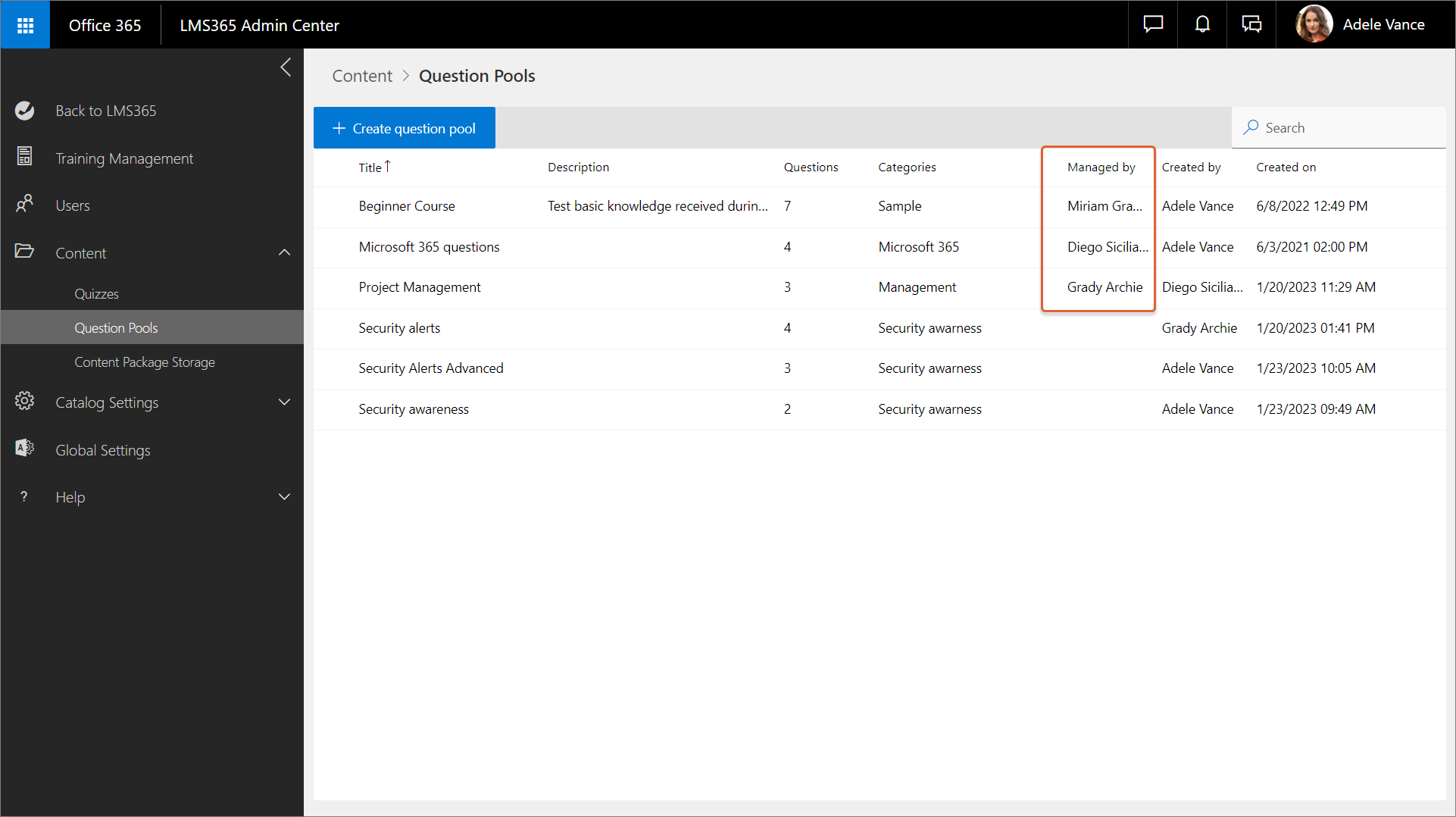 The assigned users will be displayed in the Managed by column on the Question Pools page.