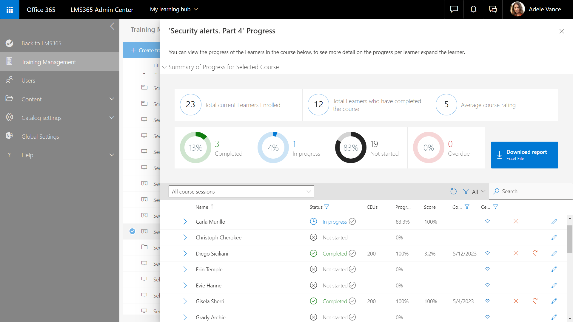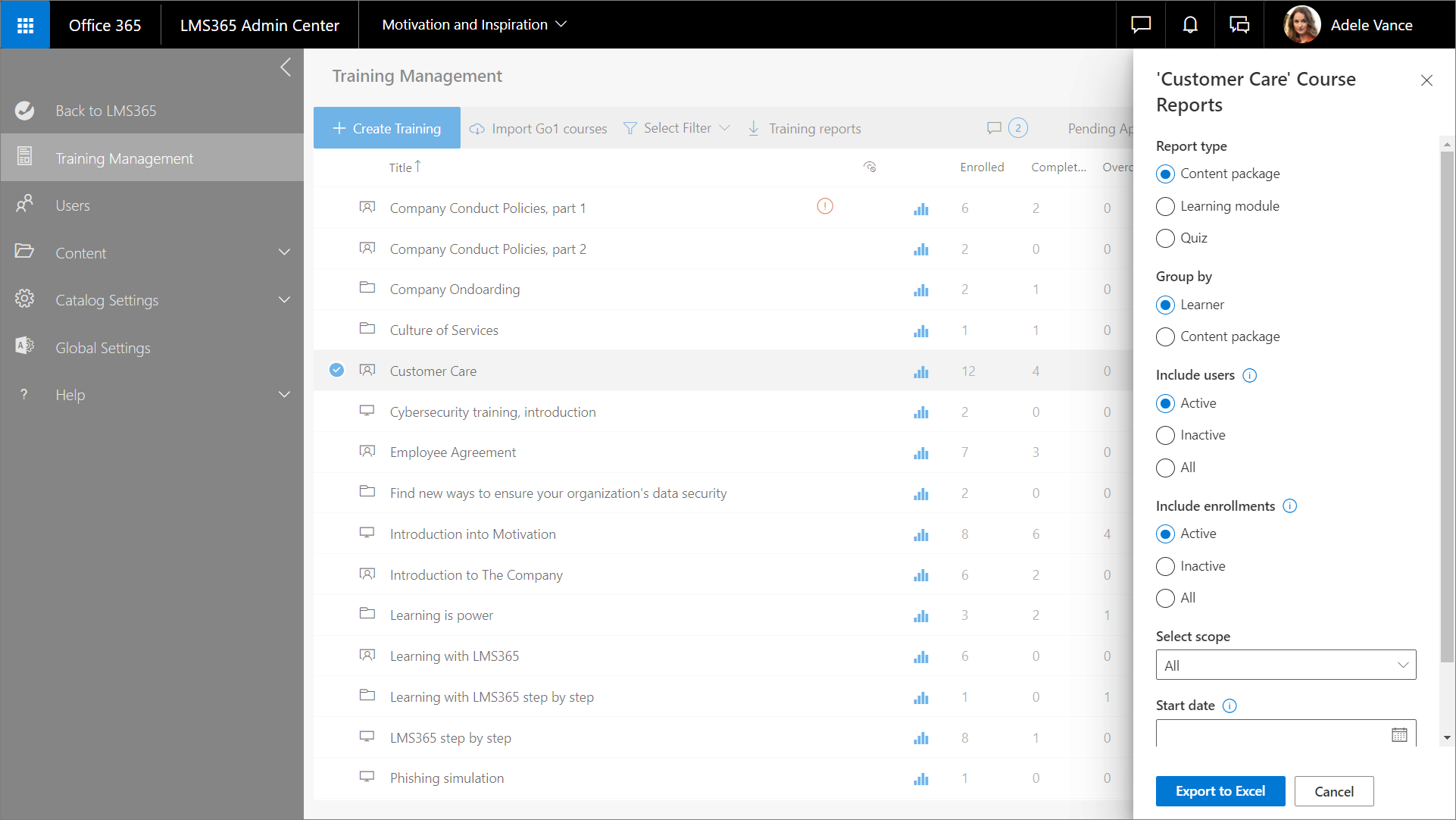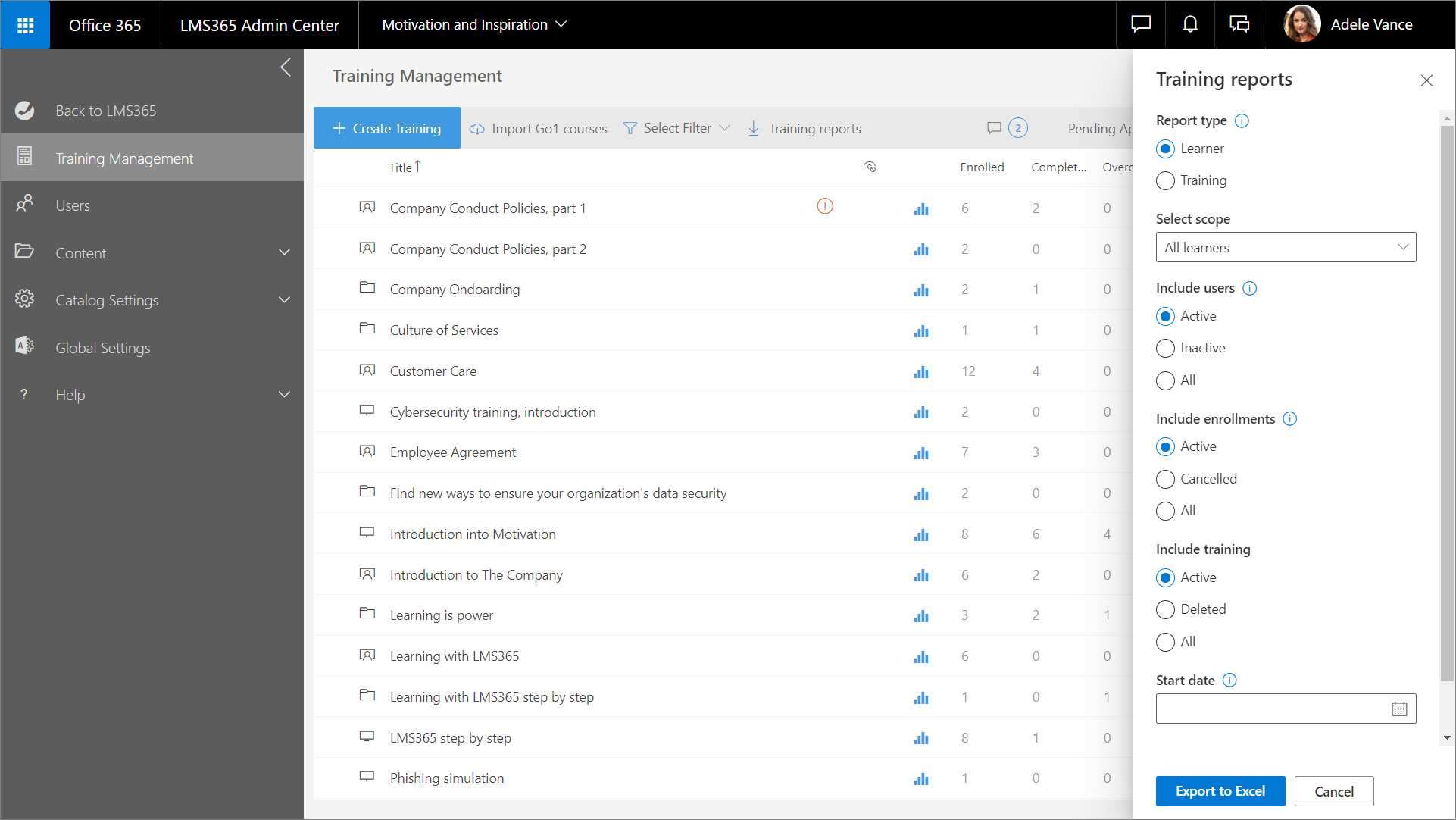 From the Learn365 Admin Center > Training Management > Training reports, you can generate reports that provide metrics on all users in a catalog and their individual, general progress.