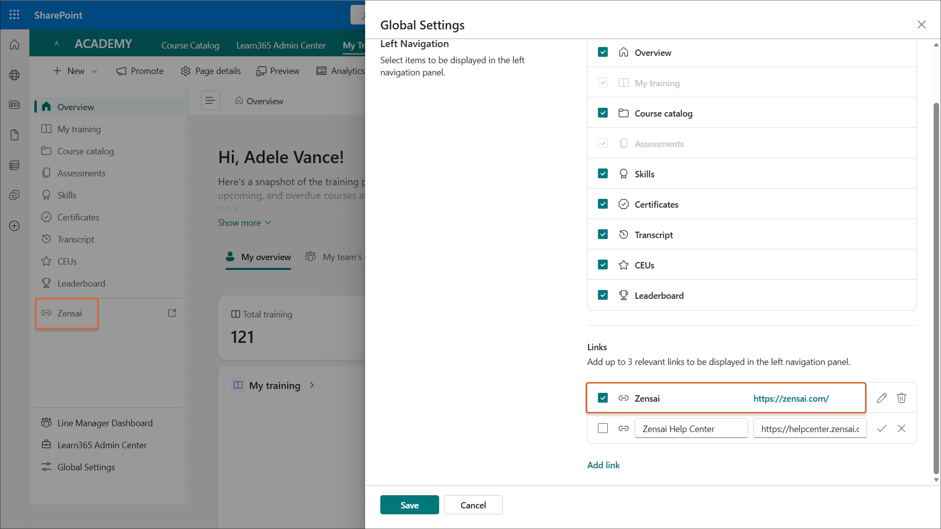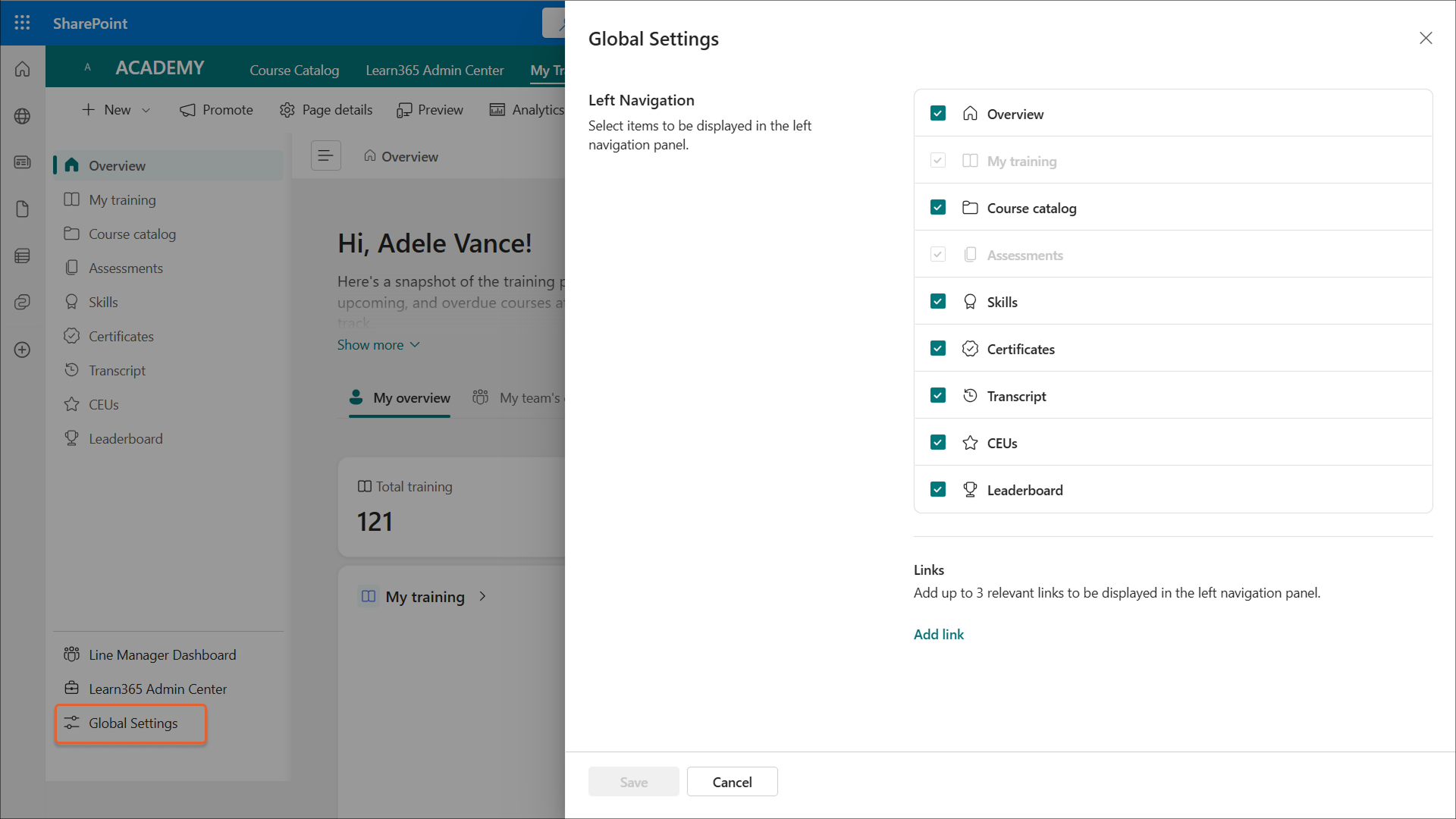 image showing how to add links to the left navigation via global settings in my training dashboard