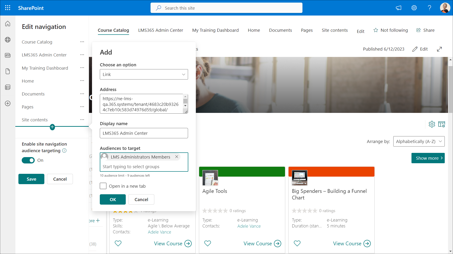 - In the Audiences to target field, add users or groups who will be able to see the link. For example, this can be a group of Learn365 admins. This field is available only if you performed step 2.