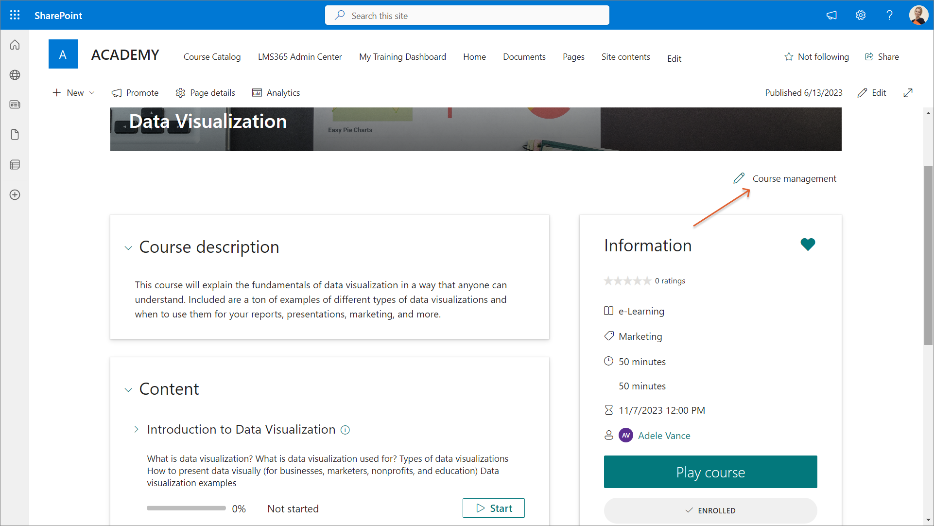 The View Course action link redirects you to the course home page, where you can view how the course description, information, and content is presented to users.
