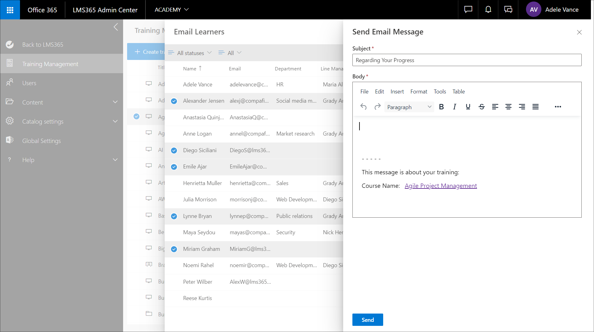 The Email Learners action link redirects you to the Email Learners panel. Here, you can see the learners who are enrolled in the course and send email messages to them.