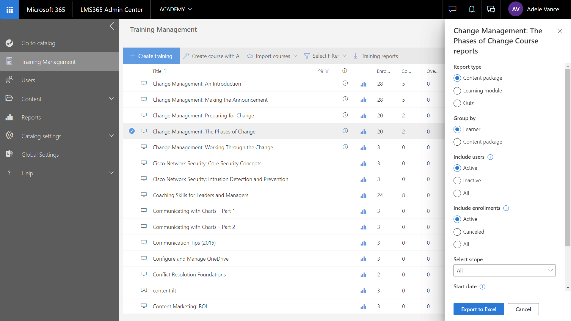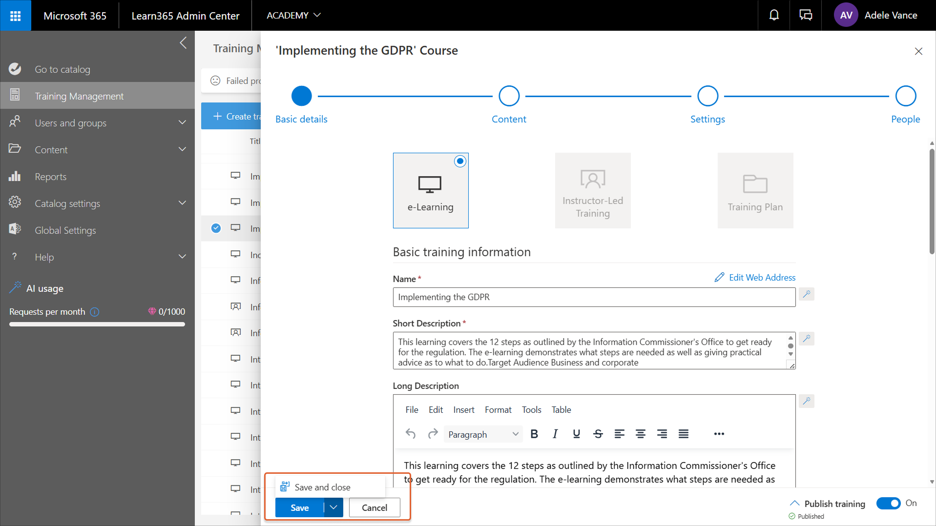 • In the Learn365 Admin CenterTraining Management > select the relevant course. The Course management panel opens on the right-hand side of the Learn365 Admin Center.