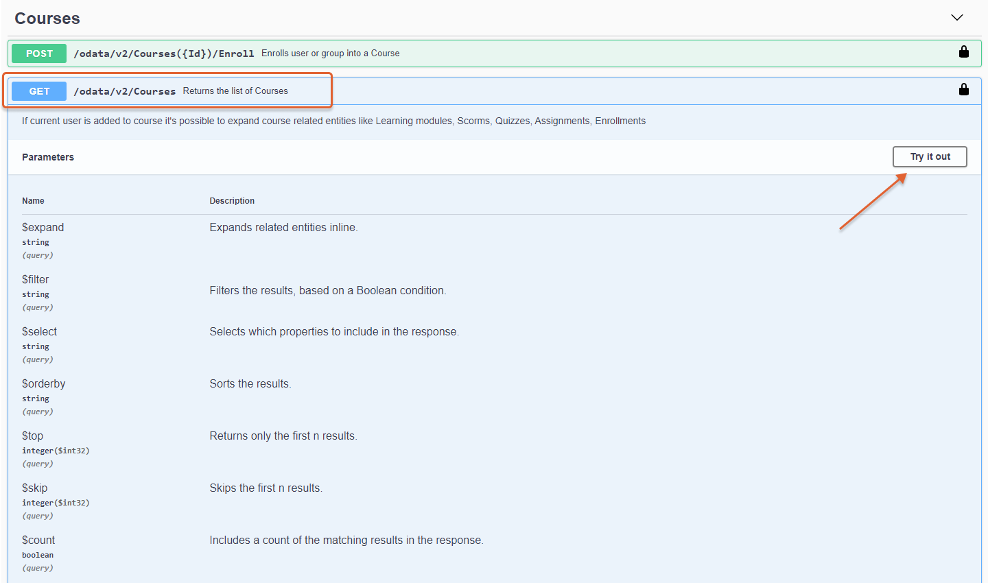 2. Find the Courses section, expand it, find the GET method /odata/v2/Courses with the Returns the list of Courses description, and select Try it out in the top left-hand corner.