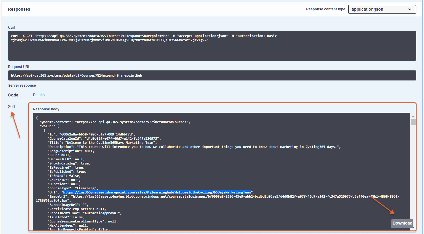 - In the Response body field, you will see all the courses of the tenant and their data, including the URL of the SharePoint site.