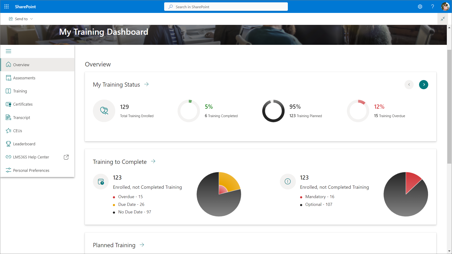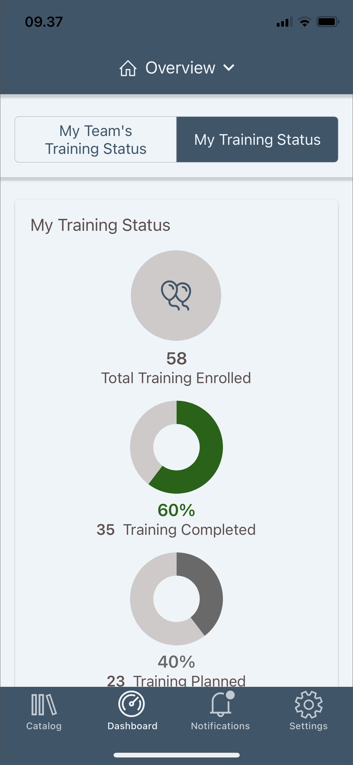 The Overview in My Training Dashboard provides each learner with a personalized, pictorial overview of their training progress. Clearly outlining the learner's individual learning objectives, as well as the progress with these, keeps learners on track with their learning journey.