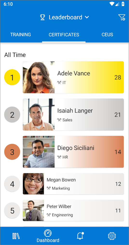 The Leaderboard enables learners to see how they are performing against others. By highlighting top-performers and clearly showcasing achievements of learners—such as earned CEUs, completed training, and acquired certificated—the Leaderboard adds a competitive element to the completion of training.