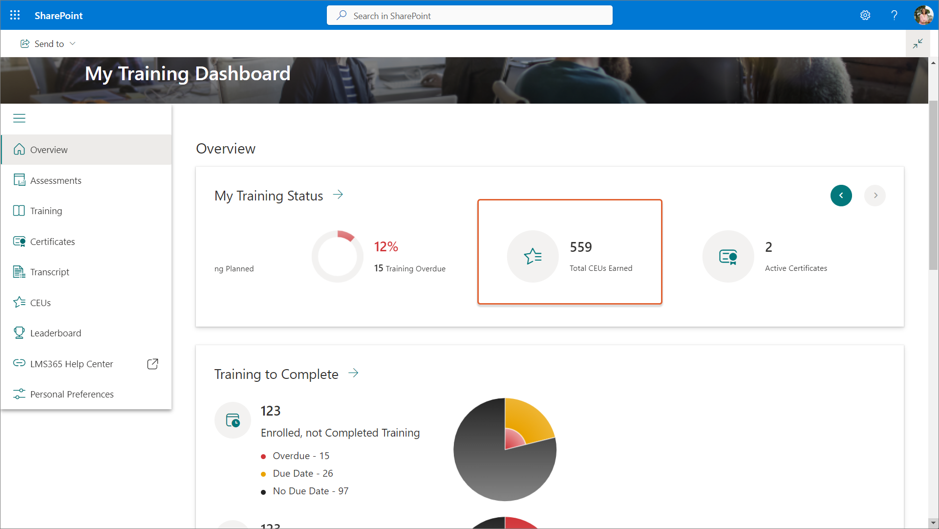 With CEUs, you can reward the learner with a number of CEUs for passing specific training. Learners can track their CEUs in My Training Dashboard and follow along as they earn more points whenever they successfully complete training.