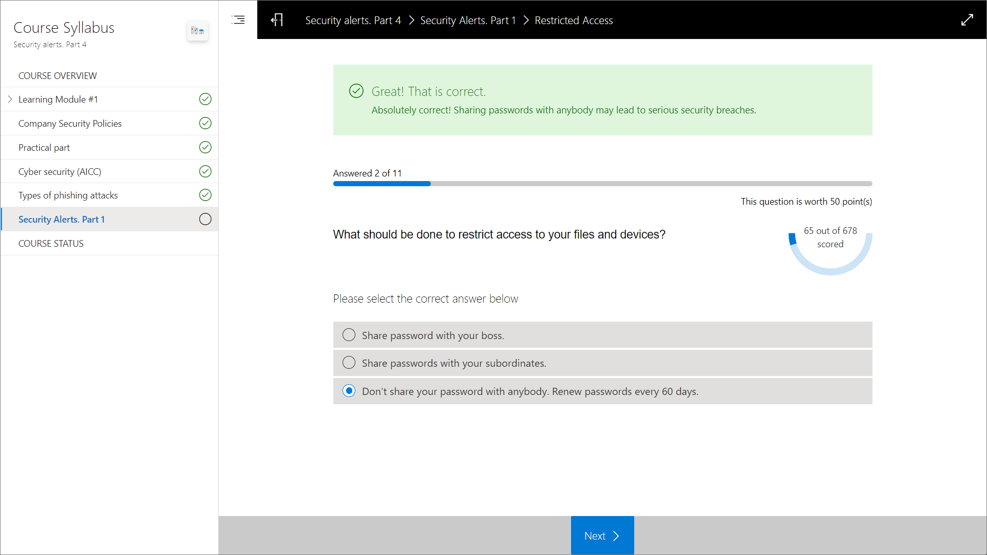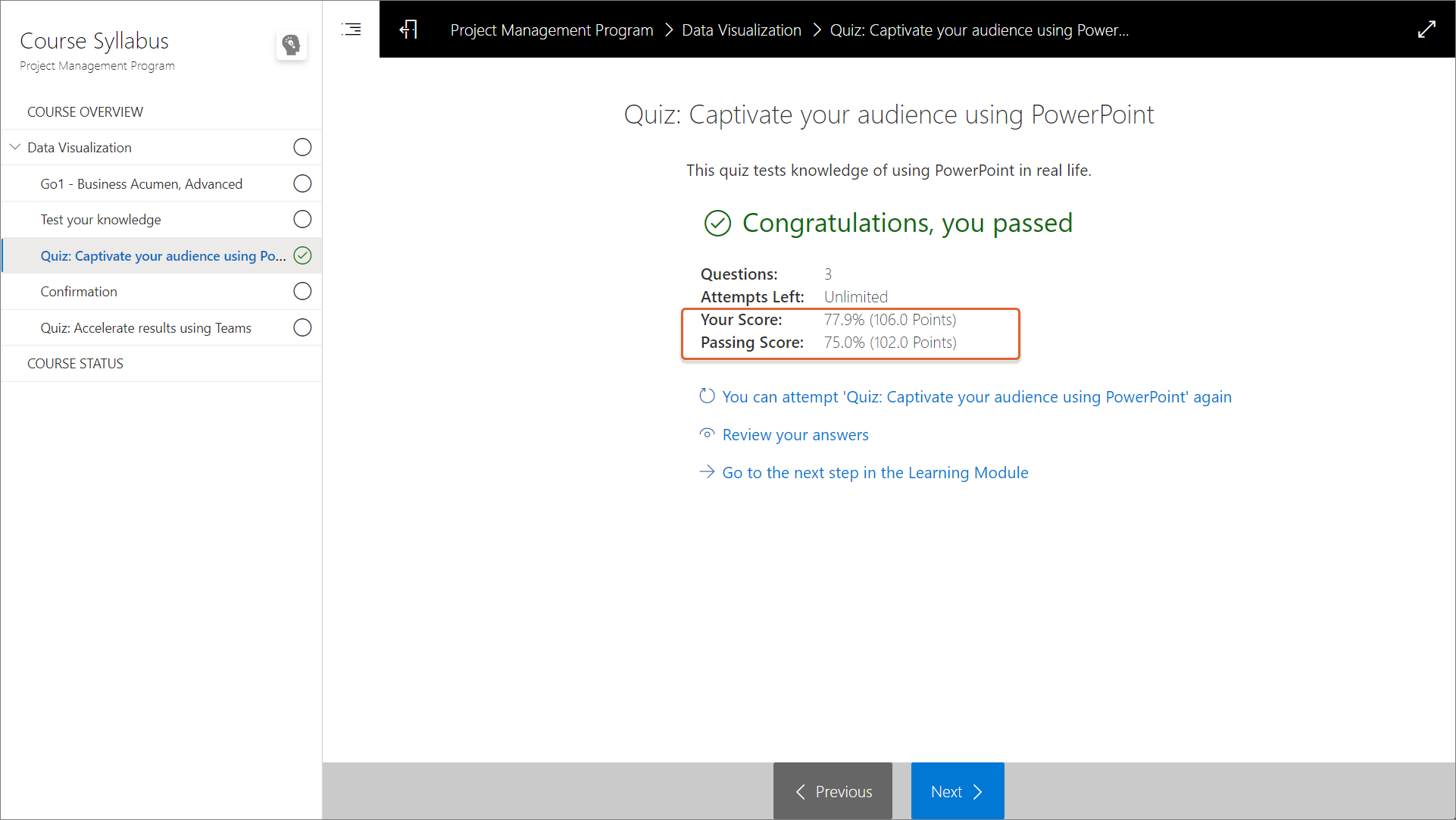 If the Show Score During Quiz and Show Score on Completion options are enabled, learners will see their quiz score during the quiz and upon completion, helping them to evaluate their performance and be rewarded with a sense of accomplishment.