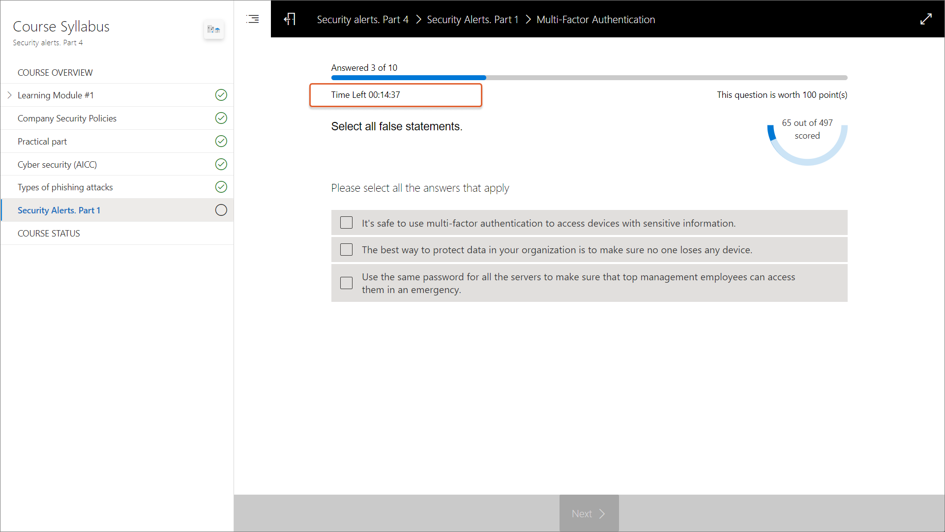 Learners can also be awarded with points for every question in a quiz that is answered correctly. If enabled, learners will see how many points each question in the quiz is worth, and at the end of the quiz, they will get an overview of how many points they earned.