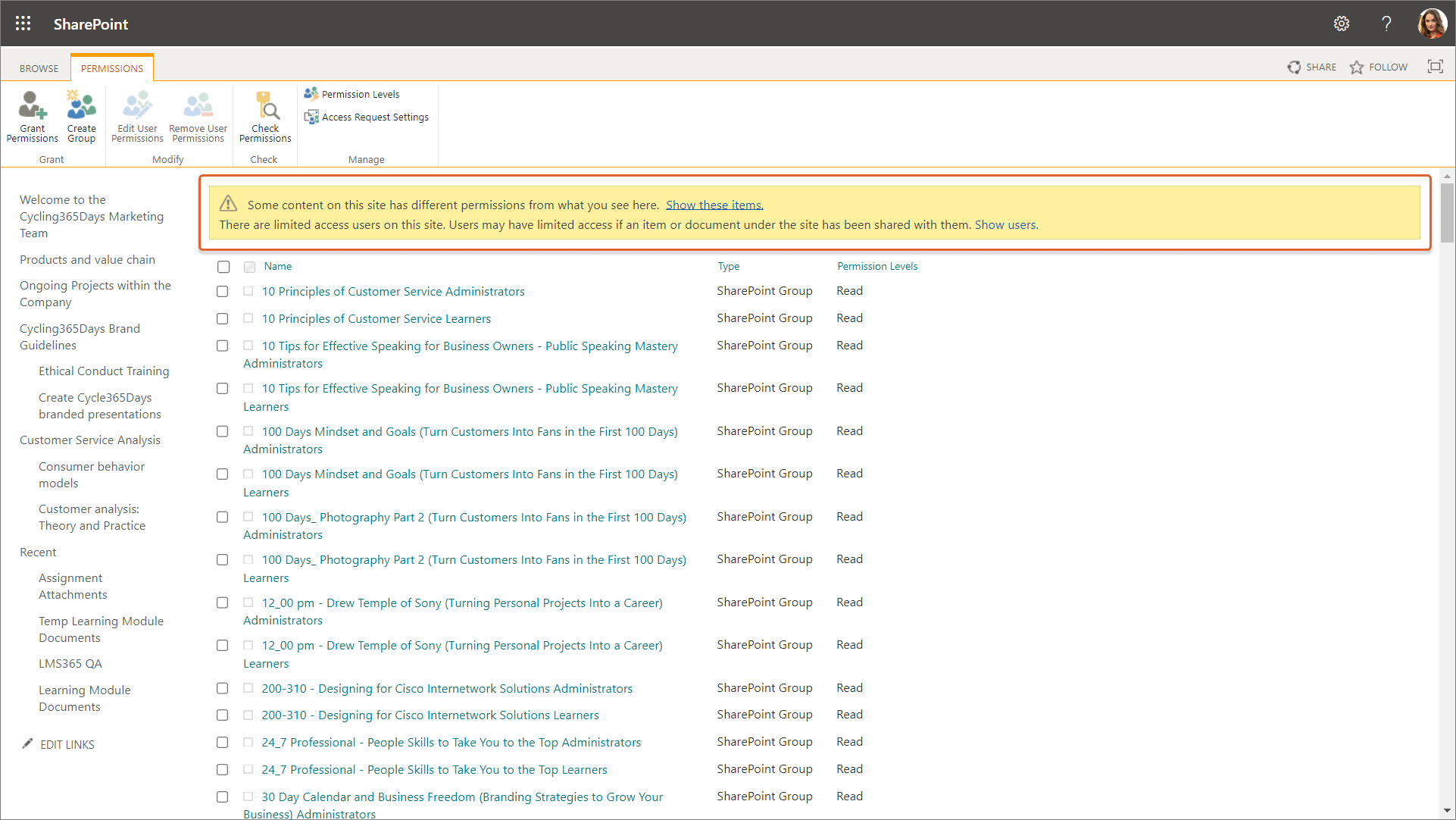 3. On the opened page that shows the site permissions, you'll see the "Some content on this site has different permissions from what you see here" and a link called Show these items. Select the Show these items link.