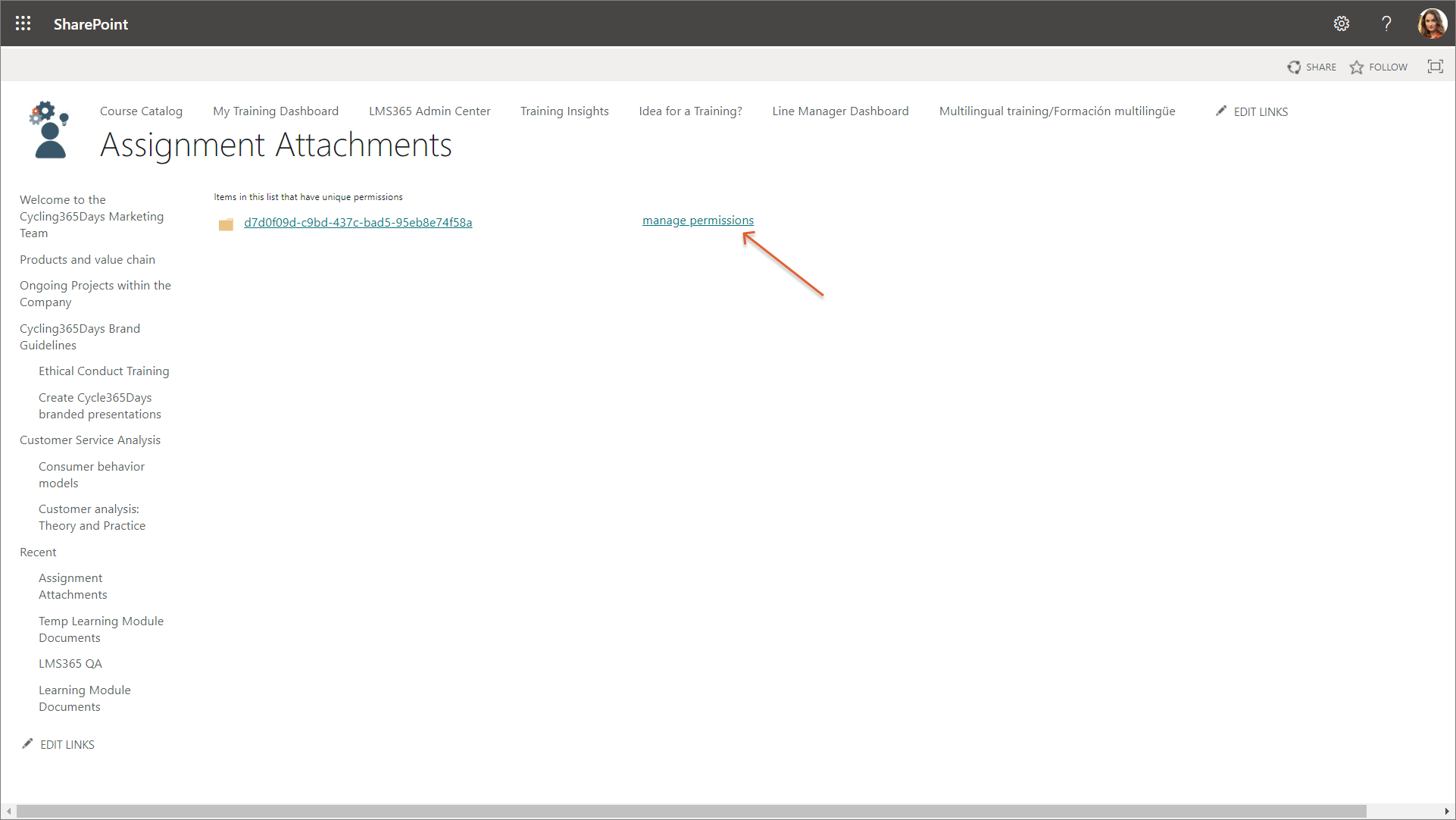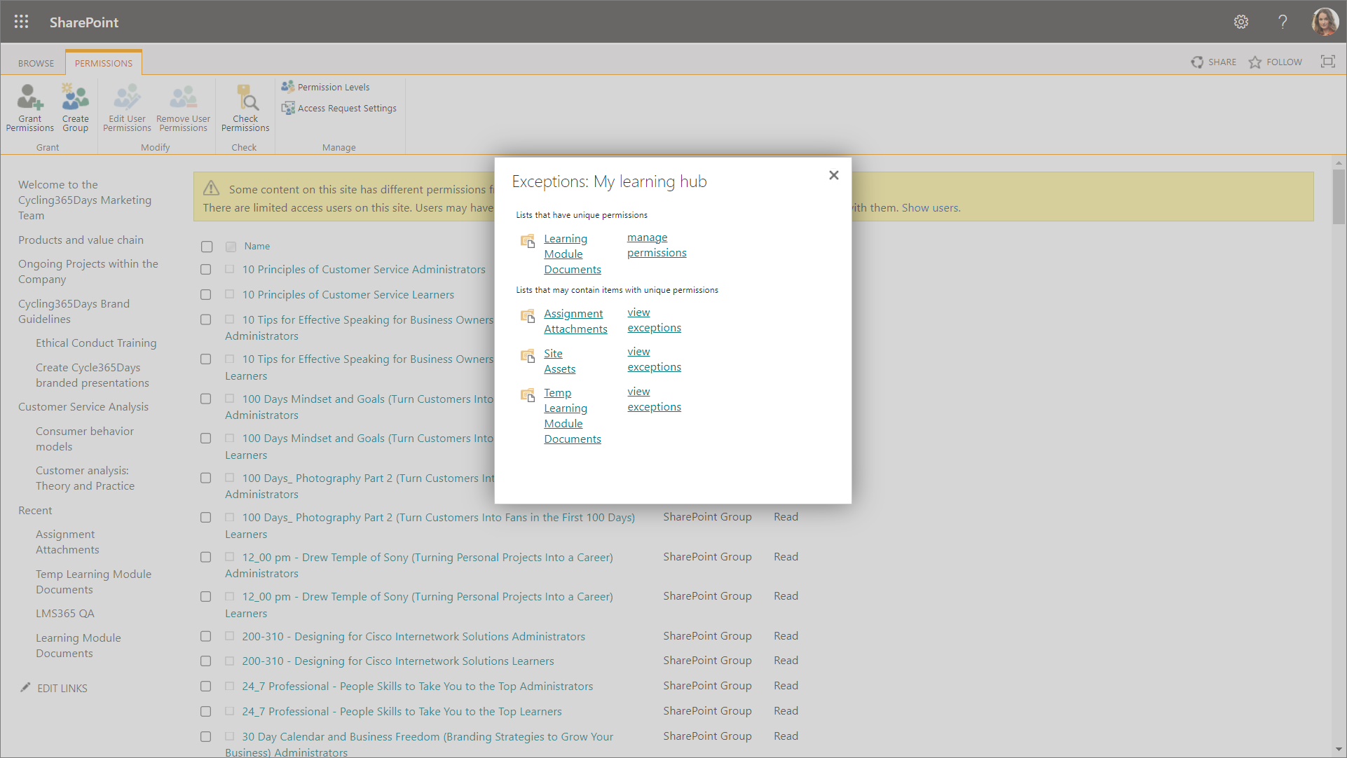 Selecting view exceptions redirects you to the page where the manage permissions option is available for the item in question.