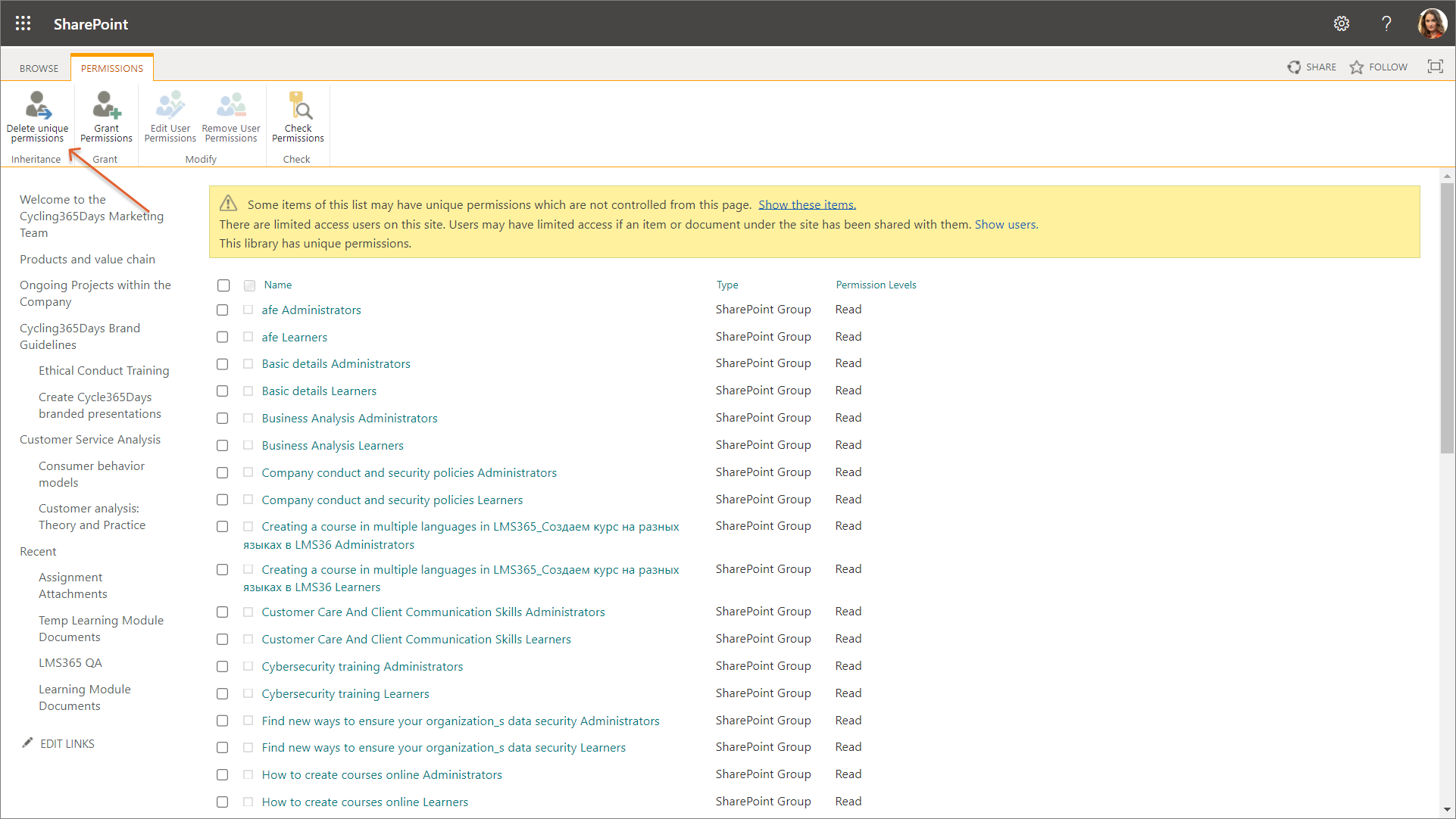 5. On the opened page, you can restore permission inheritance from a parent site using the Delete unique permissions option. When you select this option, all changes that you've made to permissions for this item will be removed, and the inherited permissions and security settings from the parent site will be restored.
