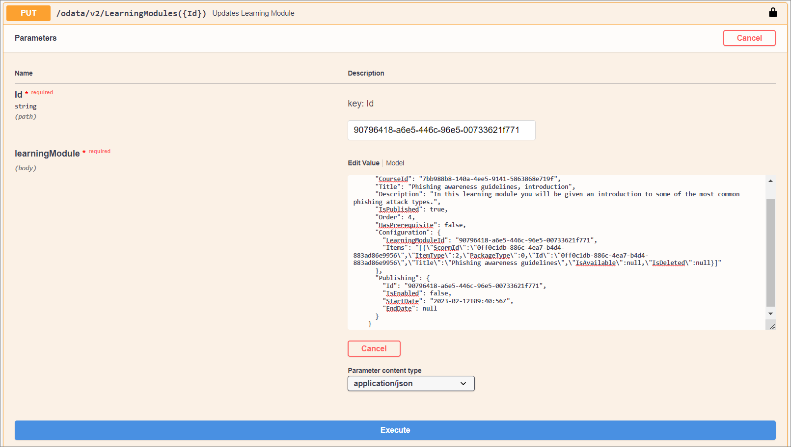 - In the Edit Value field, enter the data of the learning module you obtained in the previous section. The following example shows only the expected format of the data. Remember to use your own data when entering the parameters. Pay close attention to the IsEnabled parameter because true makes the learning module published and false makes it unpublished.