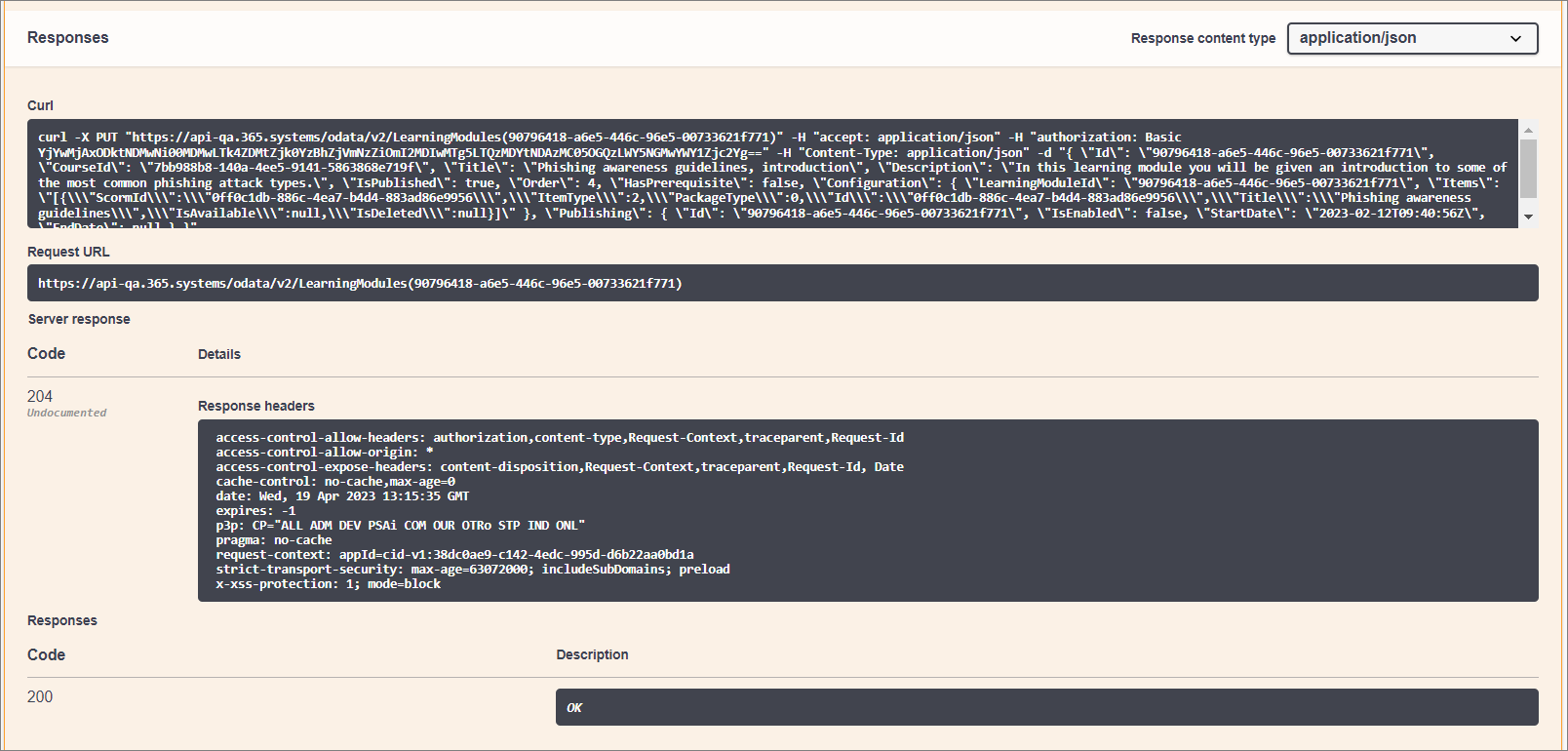- For learning modules, enter Configuration, Publishing. The response will include the publishing settings of the learning modules of the tenant and data about the items inside the learning modules.