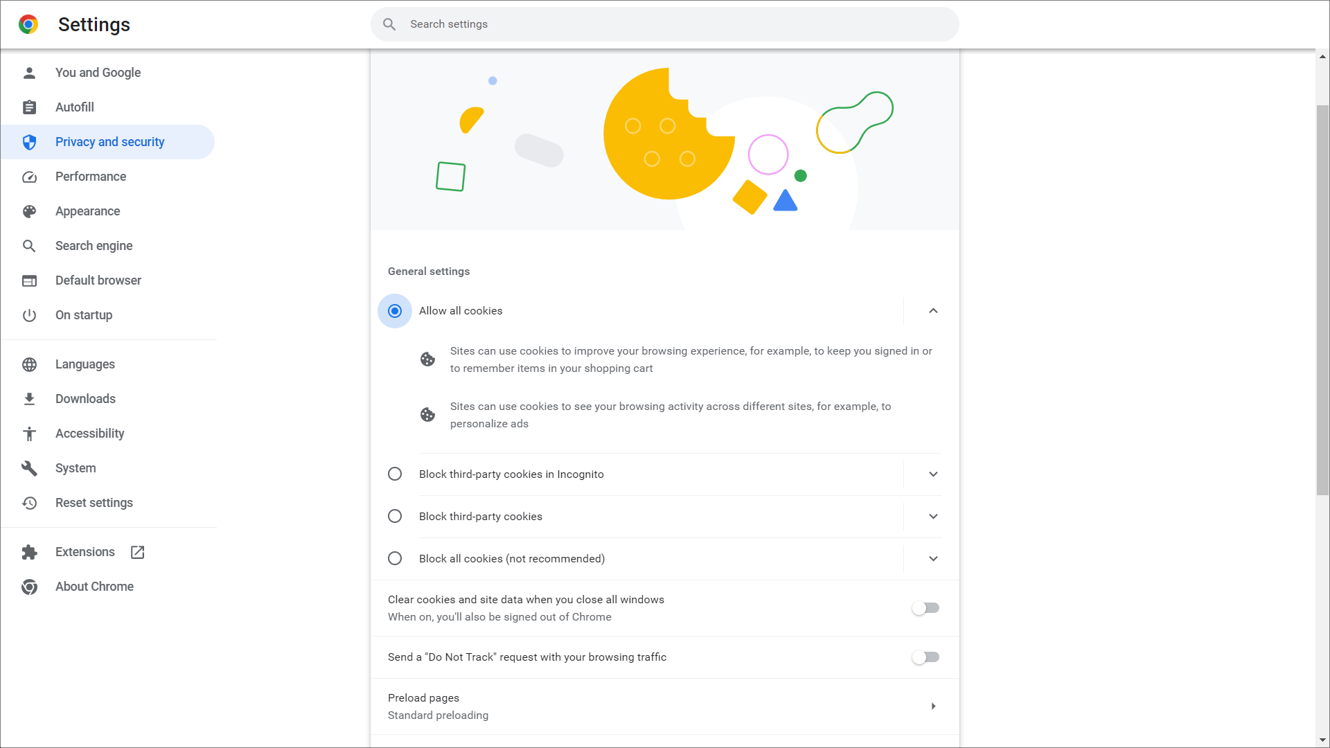 1. In the Google Chrome browser, select Settings > Privacy and Security > Cookies and other site data.