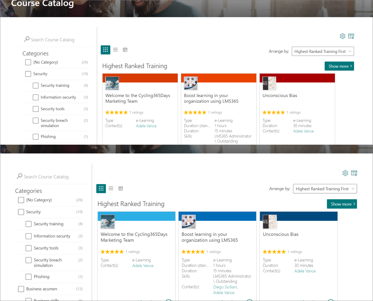 This method customizes the color of course catalog cards only. It won't change the colors of course and training plan pages.