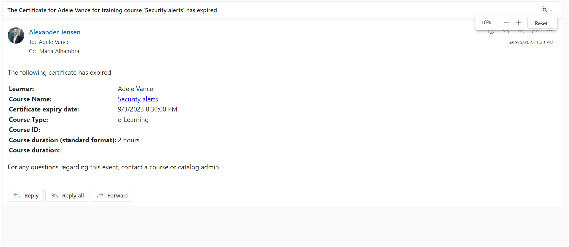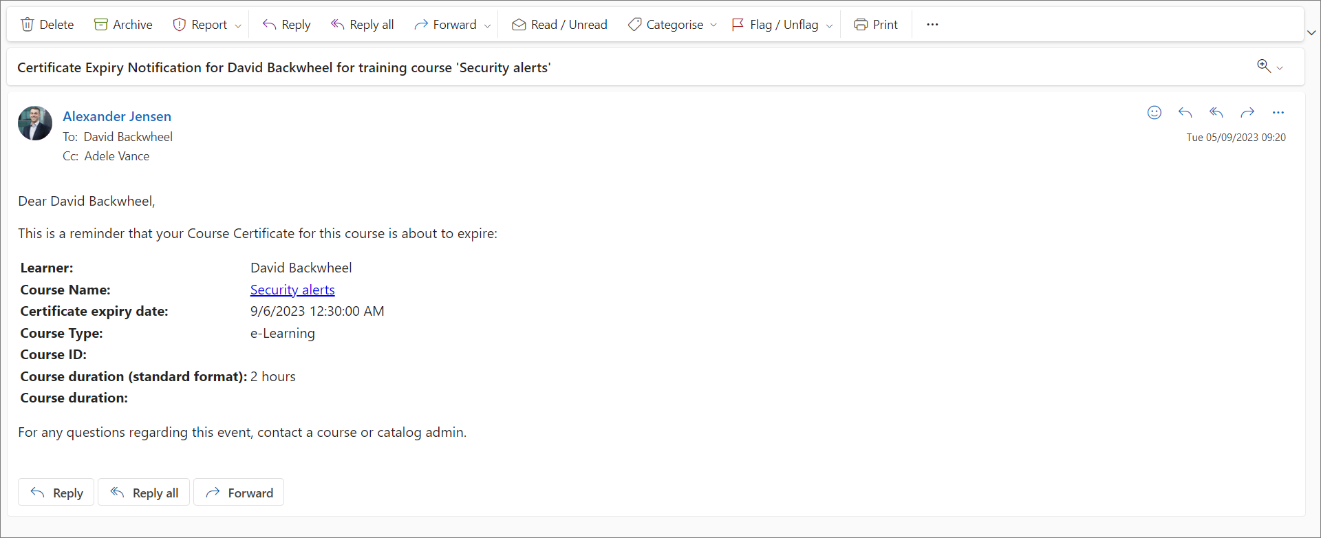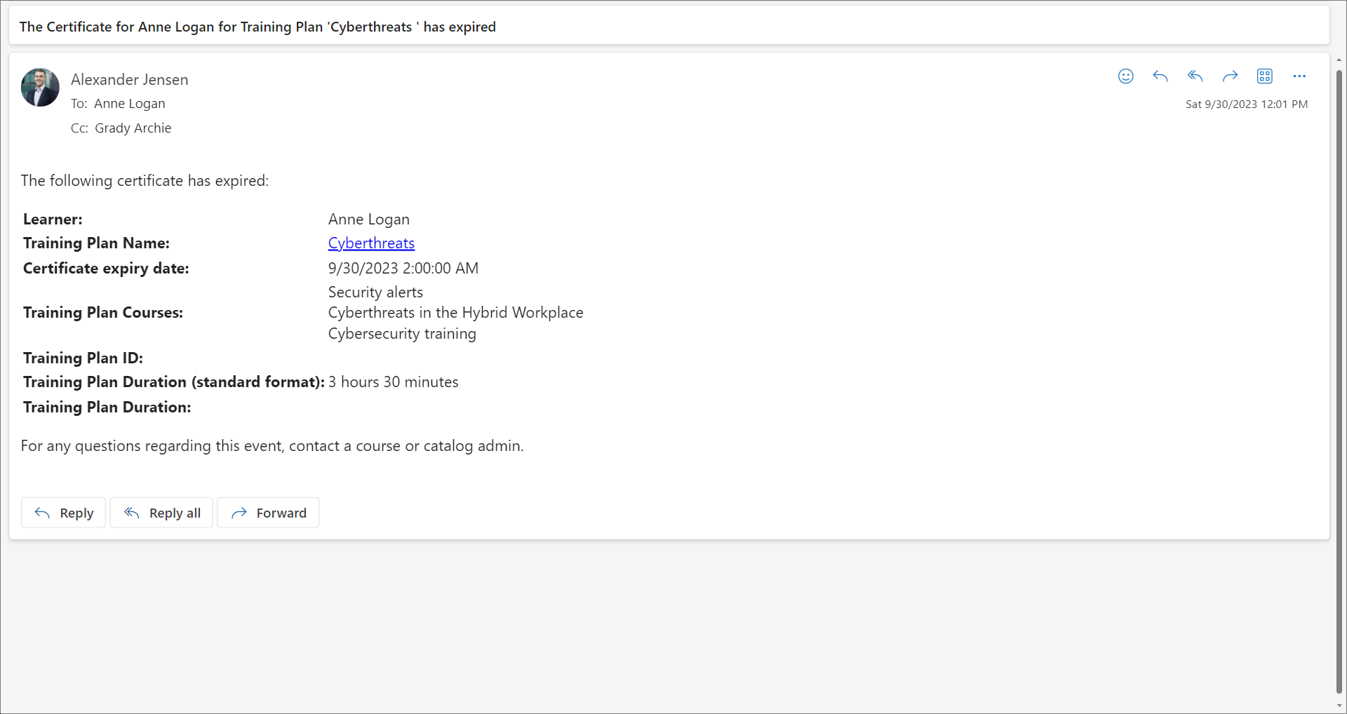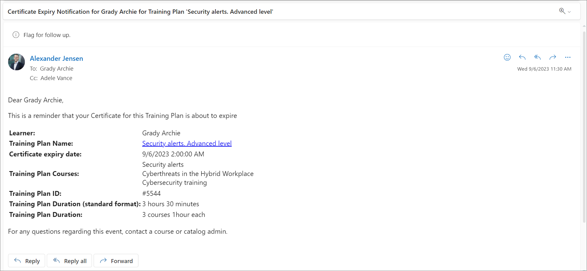 An example of the Training plan certificate expiry reminder notification for a training plan.