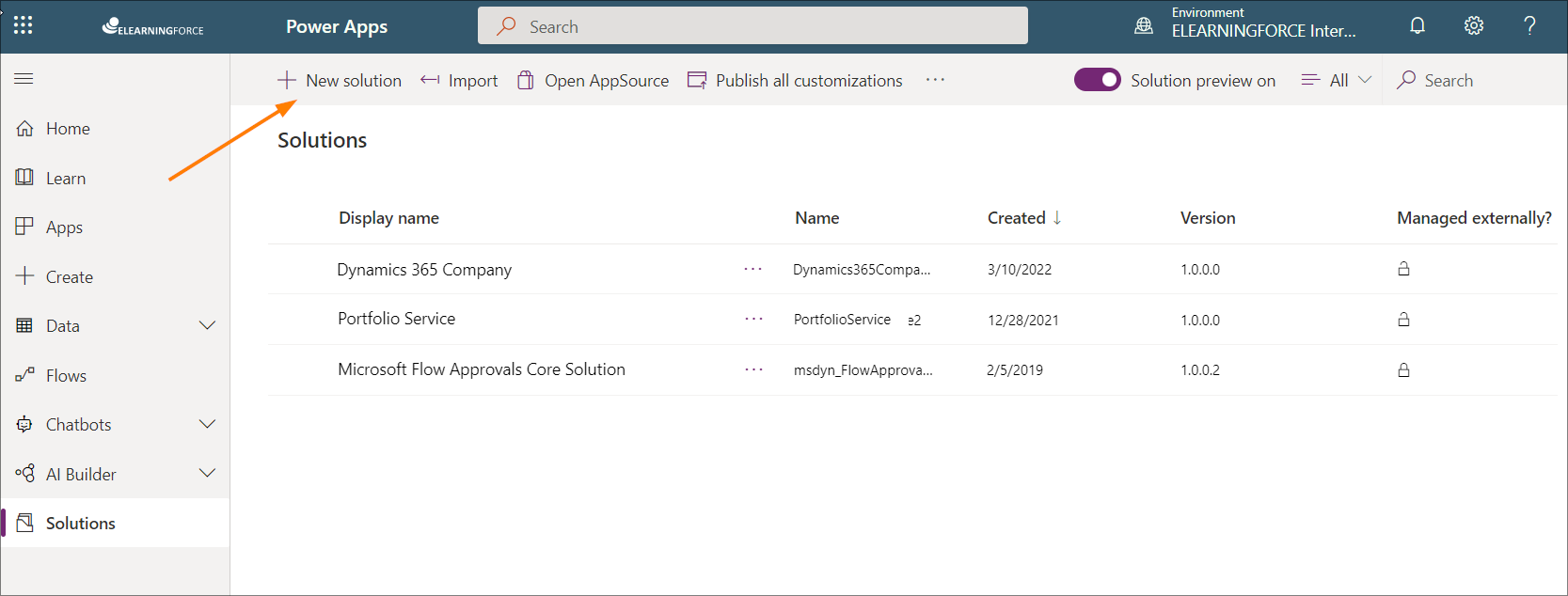 1. Navigate to the Power Apps menu, select Solutions, and choose +New solution to create a new solution. Fill out the field and select Create.