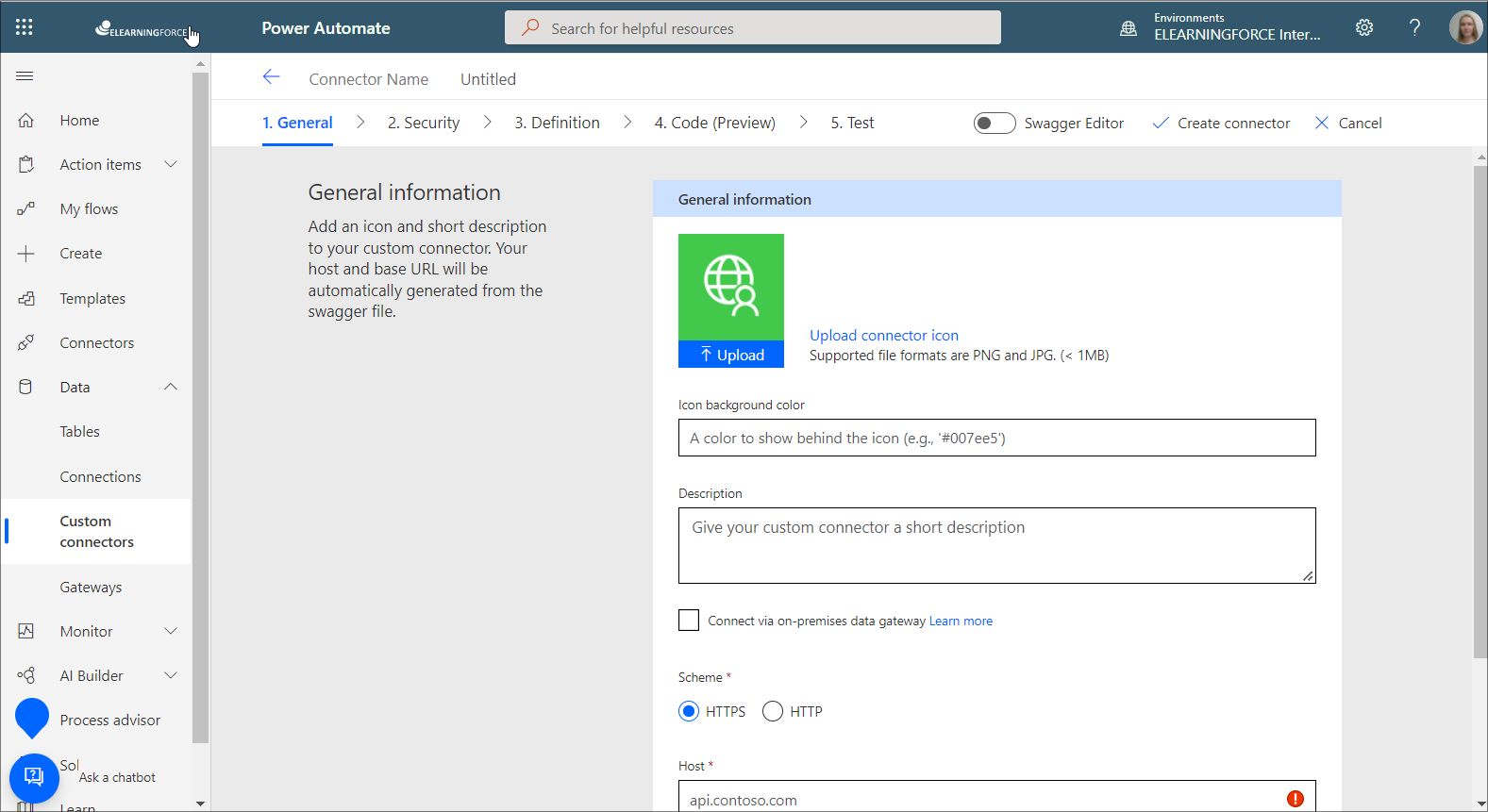 3. From the Custom connector, you'll be brought to the connector creation page.
