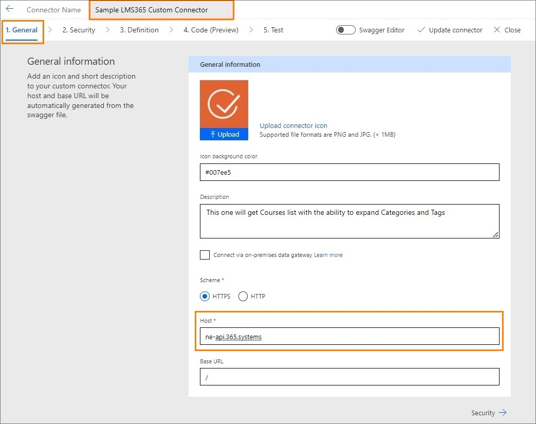 - Fill out the fields in the General section step by step: Add the connector name, upload an icon, and add a description, a scheme, a host, and a base URL.