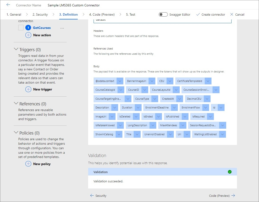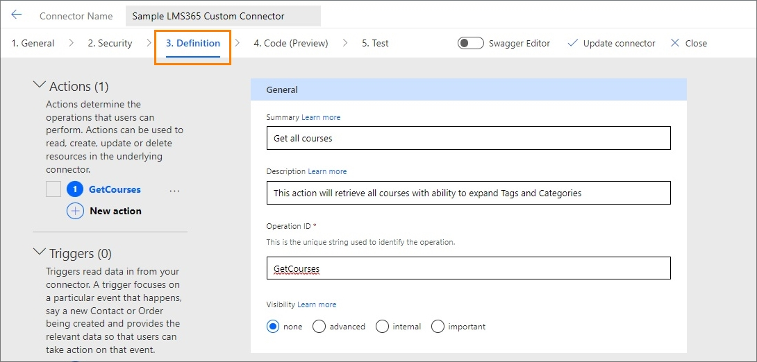 - In the next section—Definition—you need to create definitions for your connector. You can add numerous actions or triggers that will result in various responses. In our example, we'll use only one action and this should help us get the Learn365 data from the Courses table.