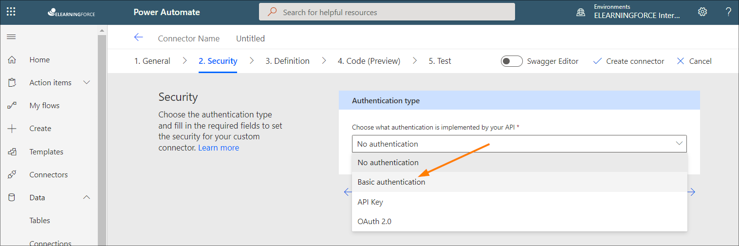 - Proceed to the Security section. Here, select the Basic authentication type.