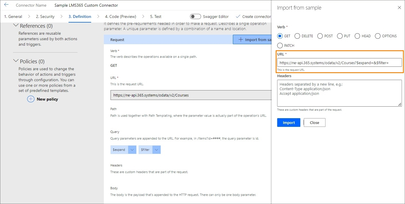 You can add a request that will be used by this action. To do this, select Import from sample, select the GET method, and specify the request URL. In our case, it will be https://ne-api.365.systems/odata/v2/Courses.