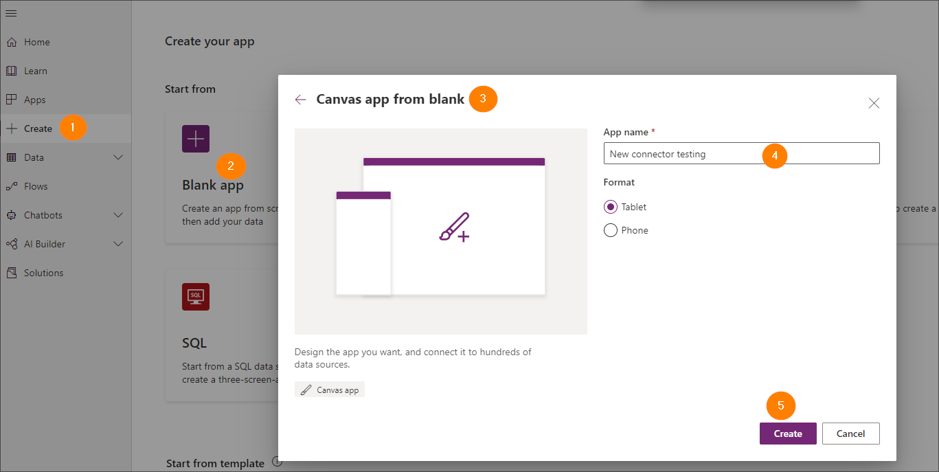 1. Navigate to Power Apps and select +Create from the side menu, then choose Blank app > Blank canvas app. Specify the name and confirm with Create.