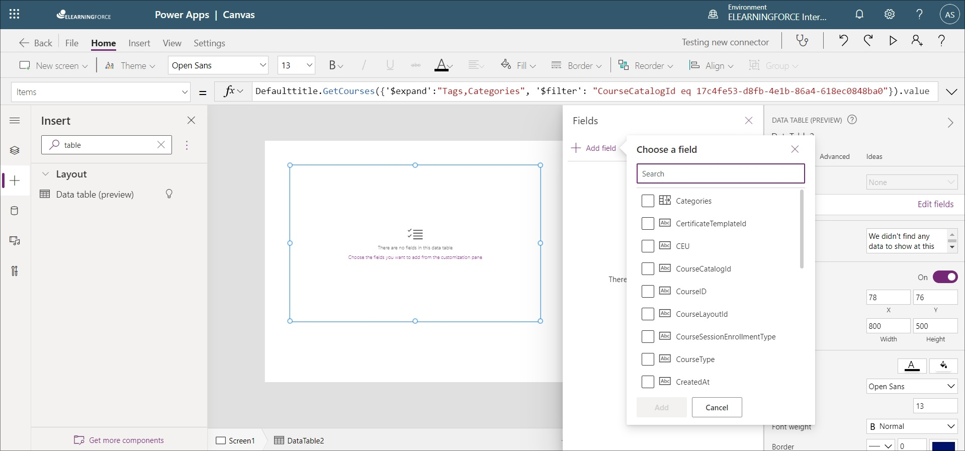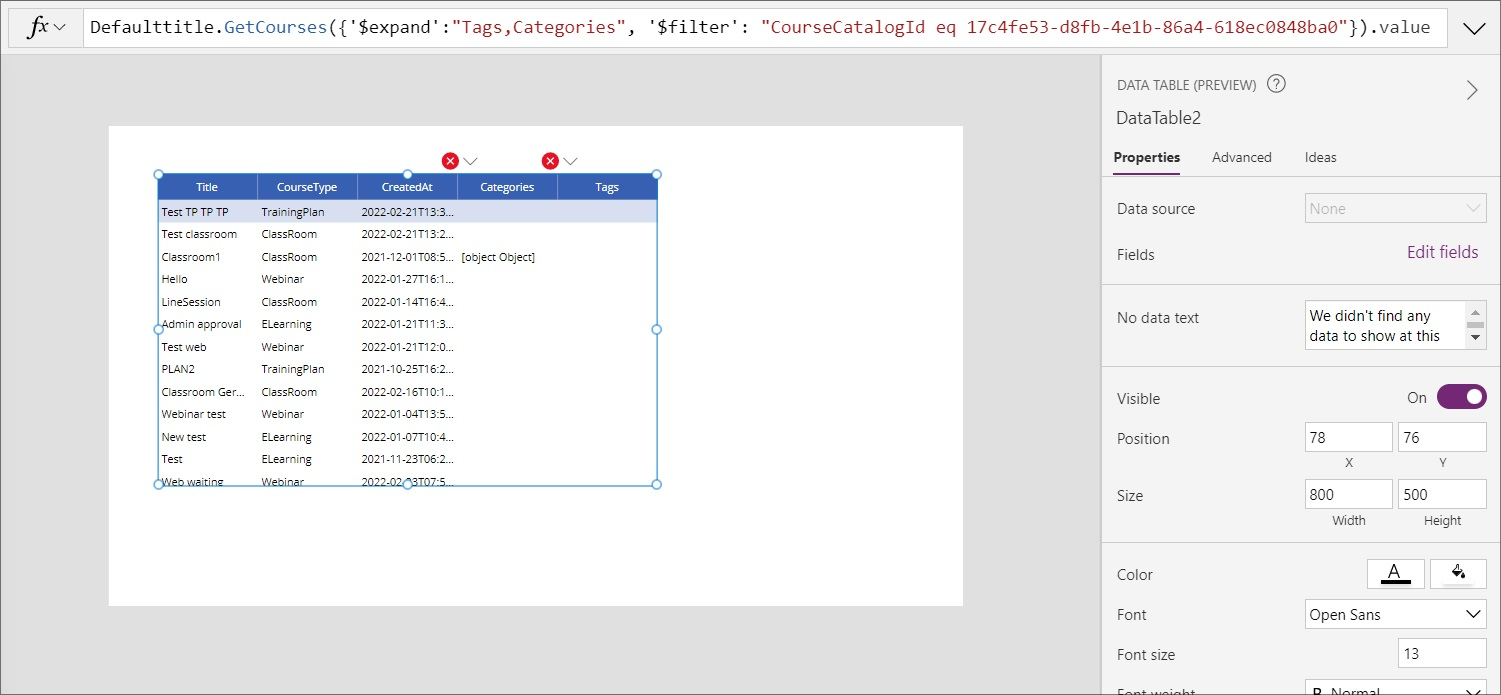 4. Using our custom connector, we will make a query to get the course list. We want to have the Tags and Categories tables expanded, also we will filter to only get courses only from a specific catalog. In this wat, the formula should look like this: