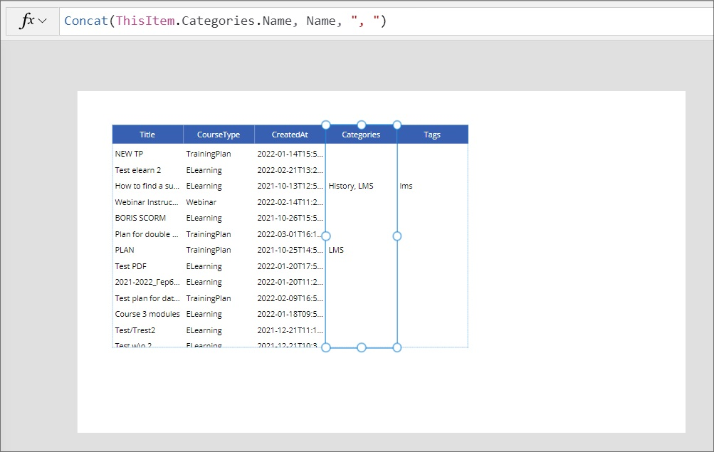 However, this can be fixed as we already have expanded these tables in our query. For these columns, we select only one value from the table using the Concat function: Select the column and instead of ThisItem.Categories put Concat(ThisItem.Categories.Name, Name, ", ").