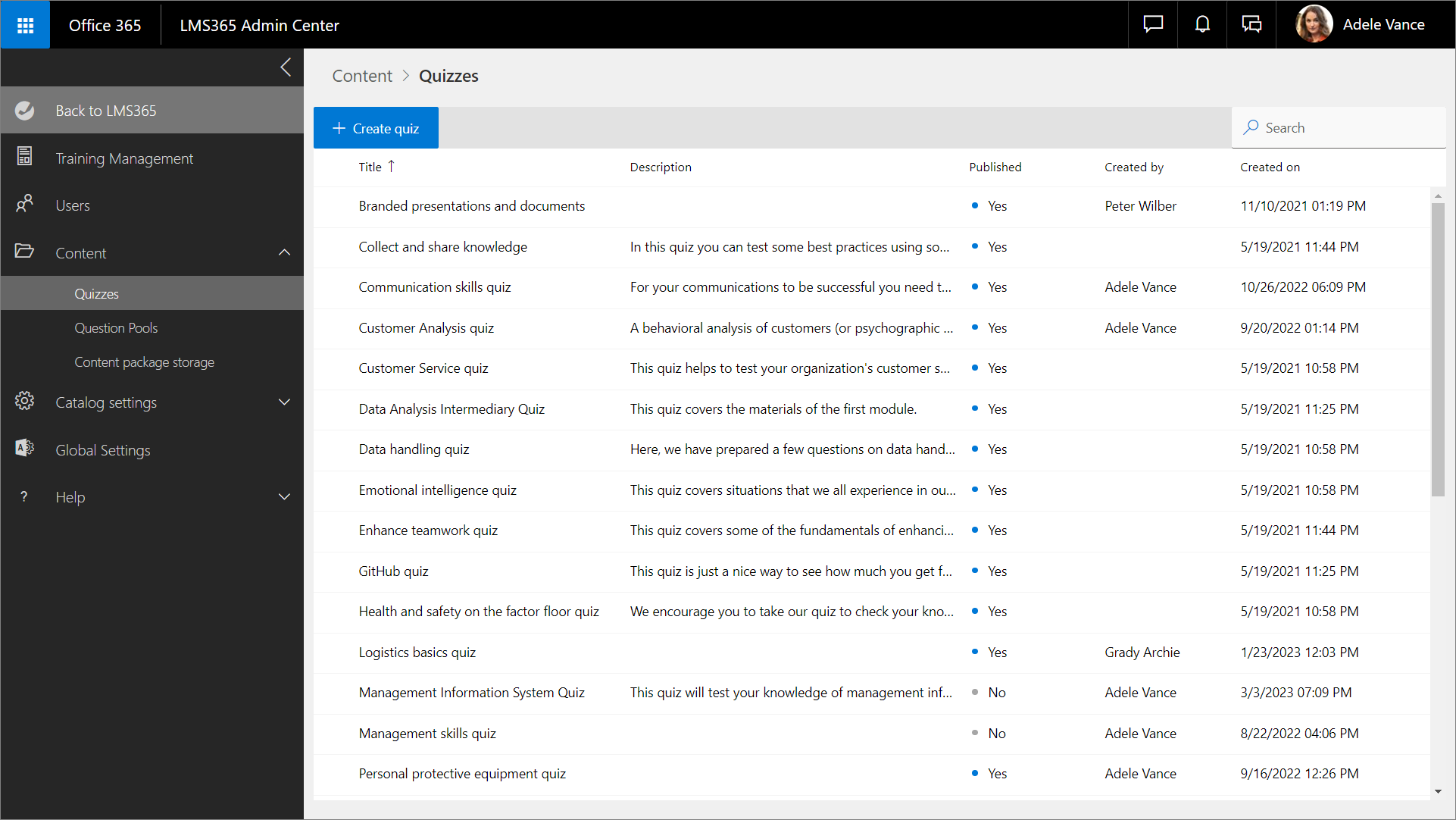 To view all quizzes of a catalog, as well as find and manage the relevant one, navigate to the Learn365 Admin Center > Content > Quizzes.