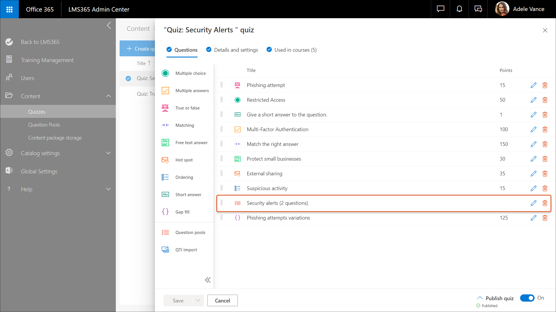 1. In the Learn365 Admin Center, go to Content > Quizzes > Select a quiz.