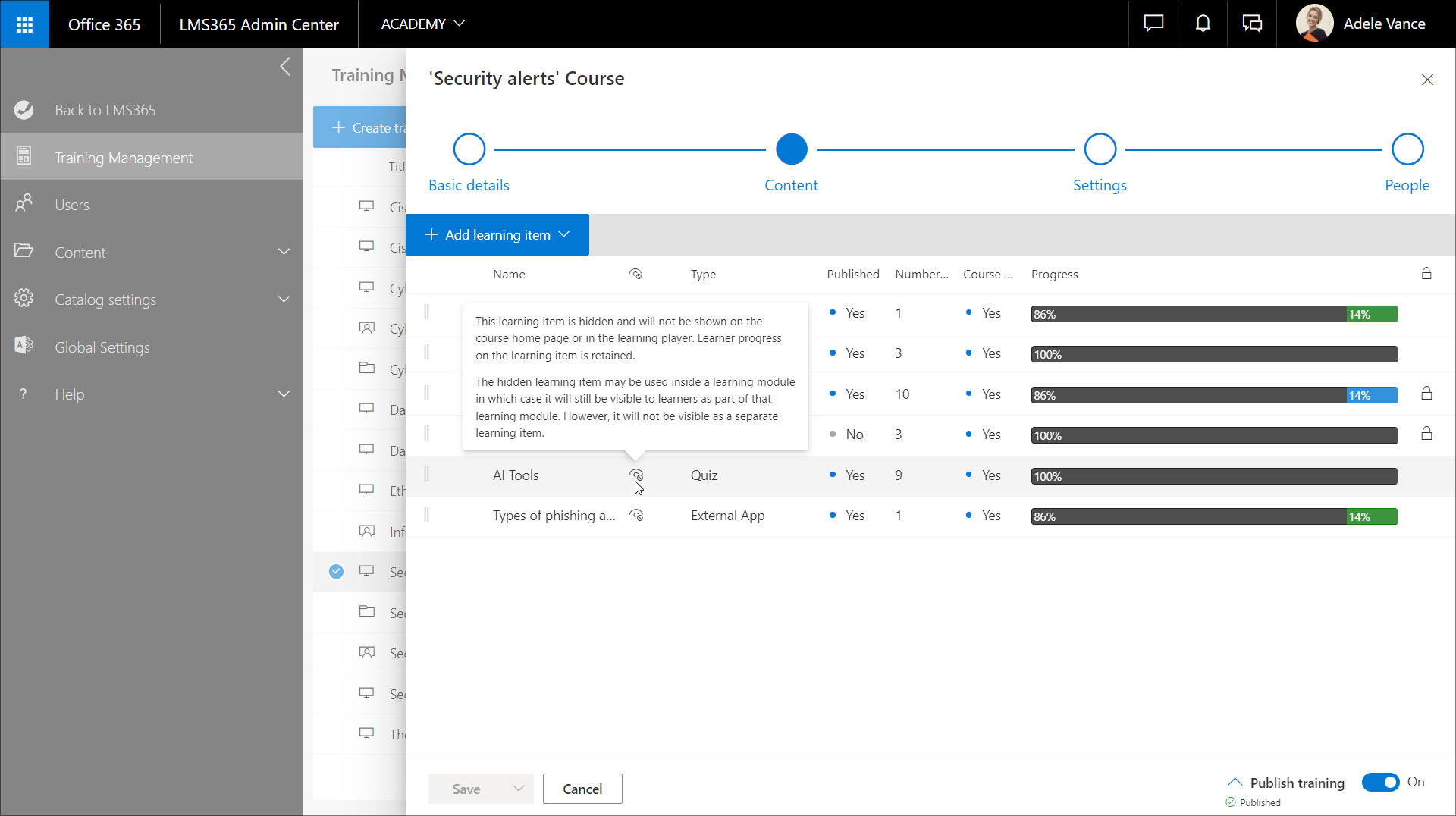 The eye icon in the column of the Content section shows that the learning item is hidden.