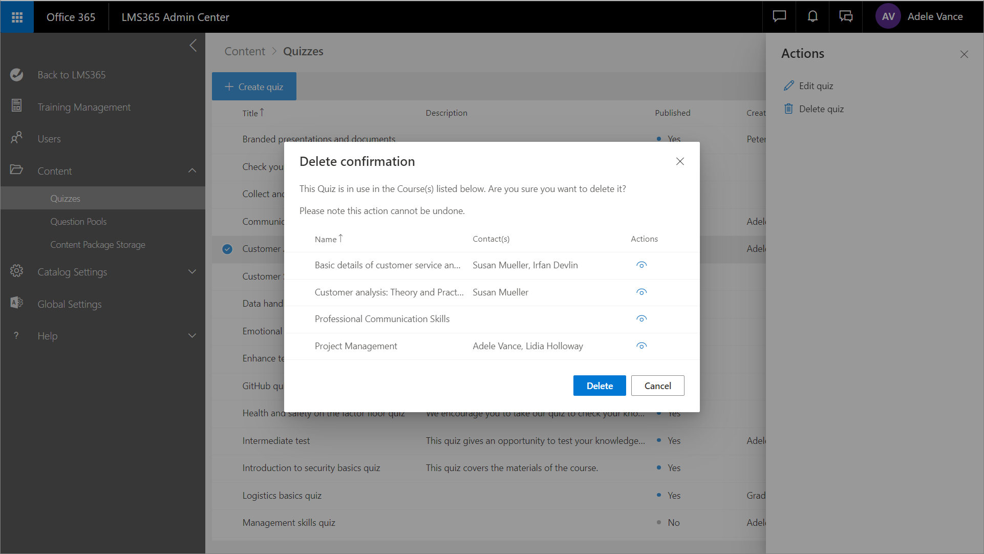 - If the quiz is used in courses, the Delete confirmation message lists the courses this quiz is used in. The list can be sorted by the Name column. Selecting the eye icon will redirect you to the course home page. To proceed with quiz deletion, select Delete. This action can't be undone. To cancel the action, select Cancel.