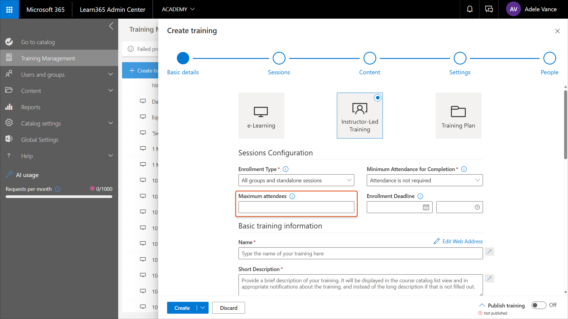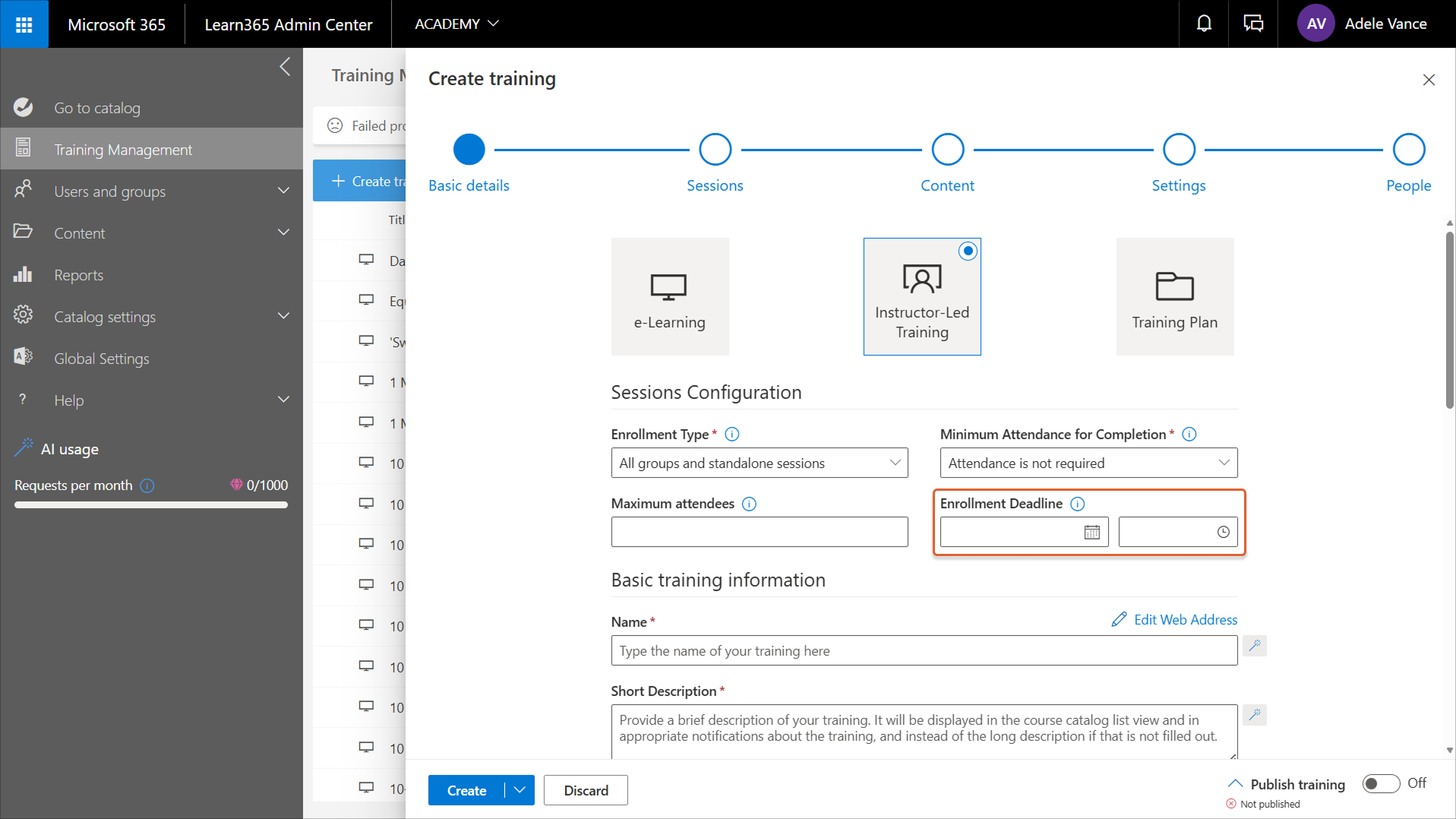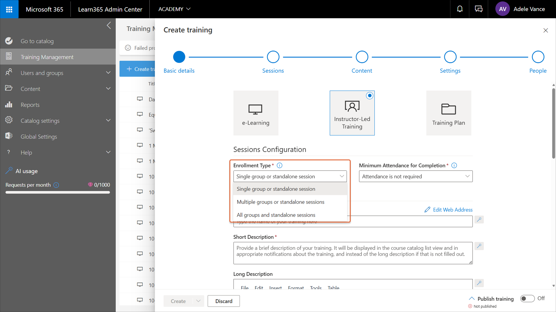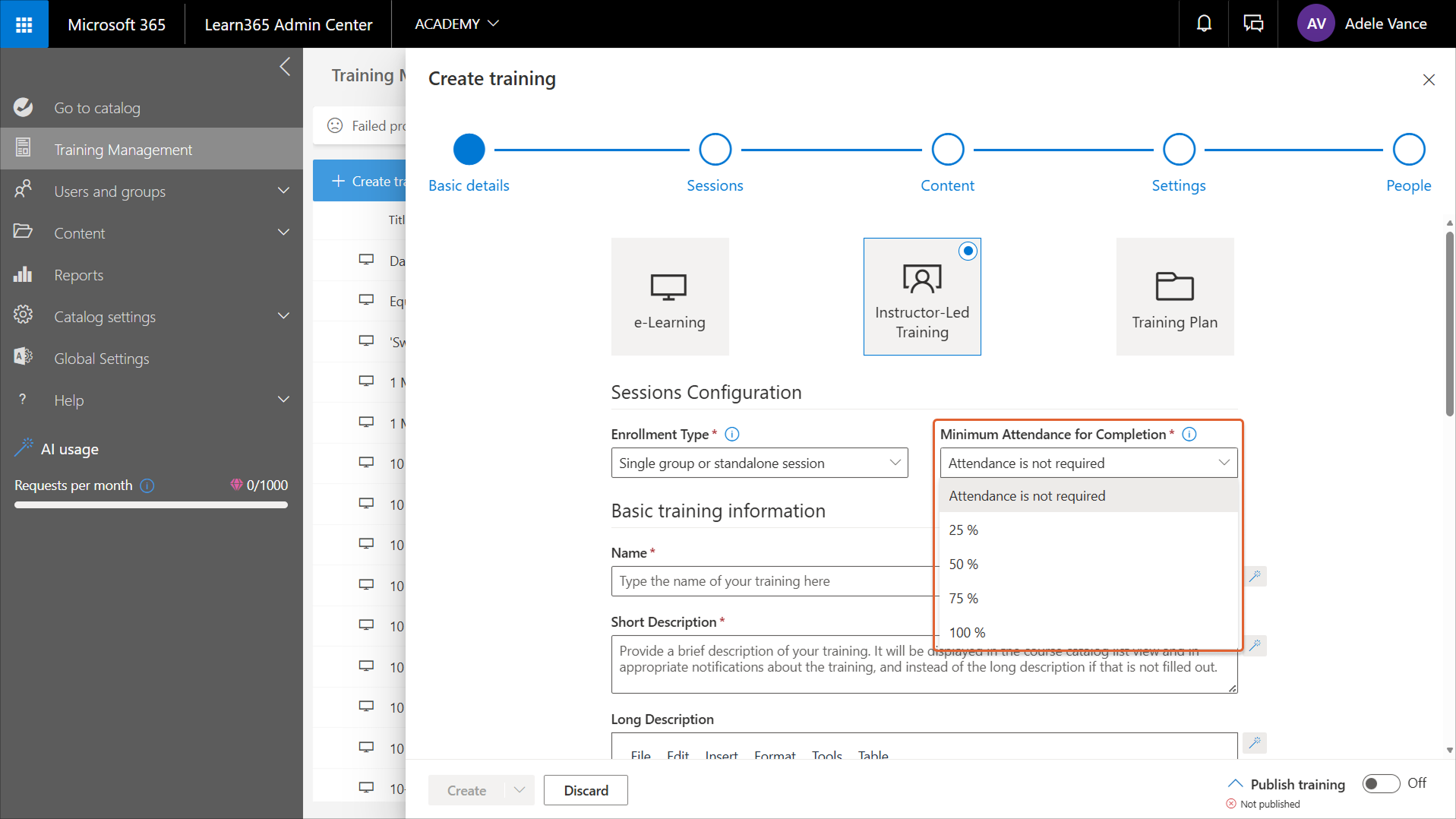 To create an instructor-led training course, go to the Learn365 Admin Center > Training Management > Create training
