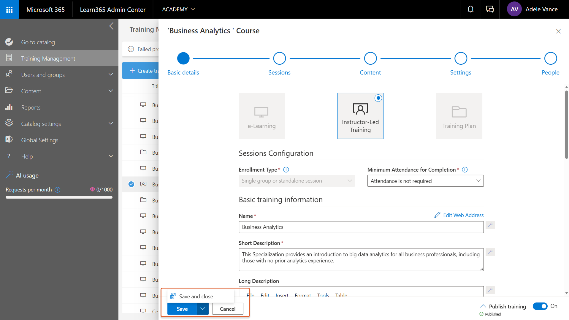 It may be necessary for catalog and course admins to change instructor-led training settings, update course information, add sessions and session groups, or delete the course. This can all be achieved via the Course management panel.