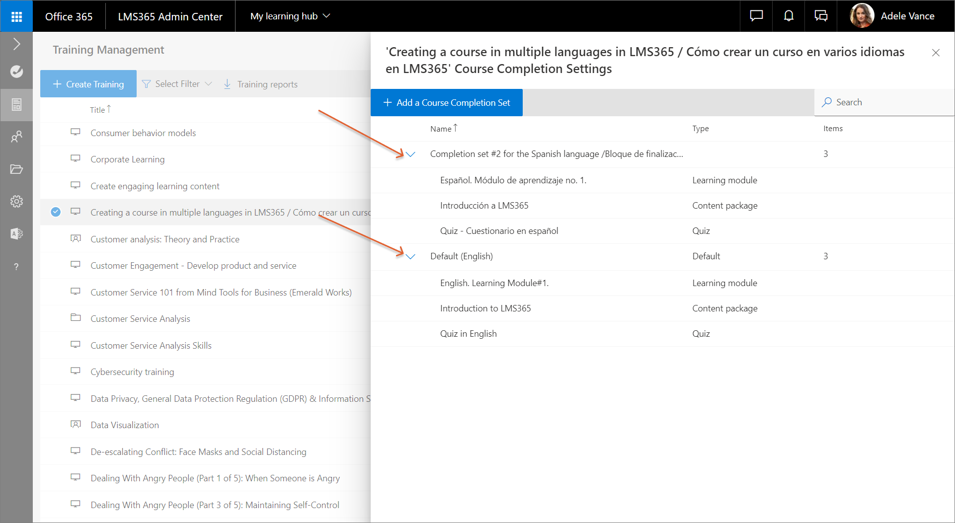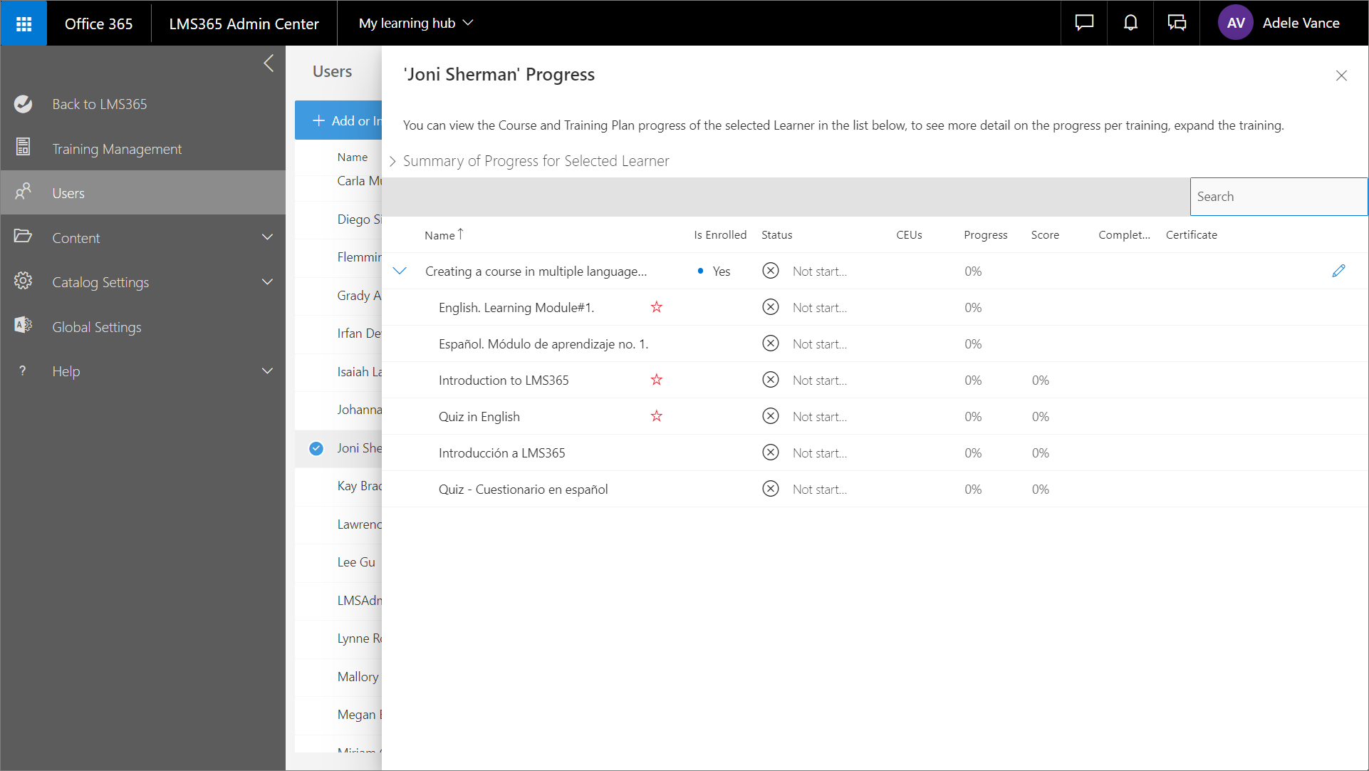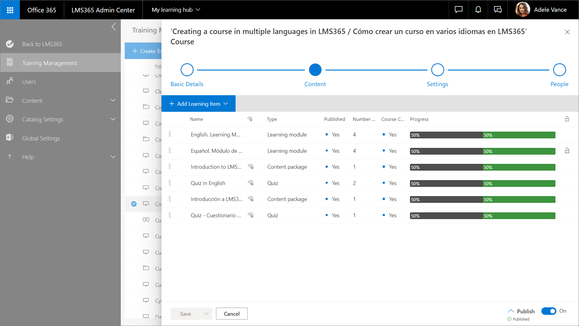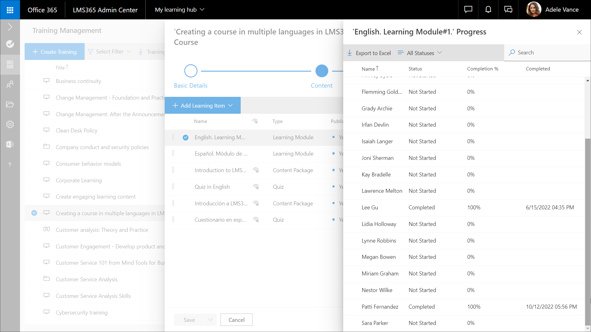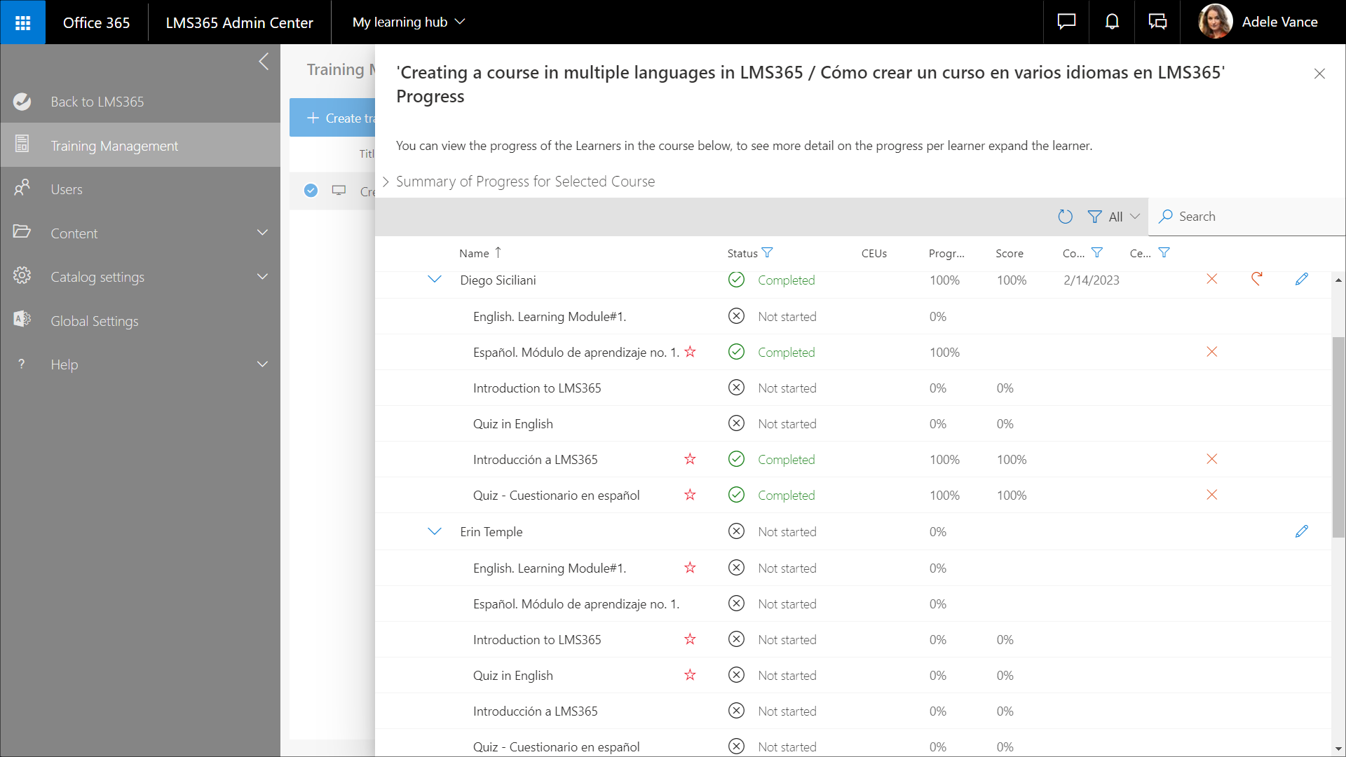 Adele Vance has completed the course by completing the learning module in English. Even though the content package in English (with the Completed status) is part of the English language learning module that she selected, the Completion Status percentage is 50% because this is the average of all the content packages in the course.