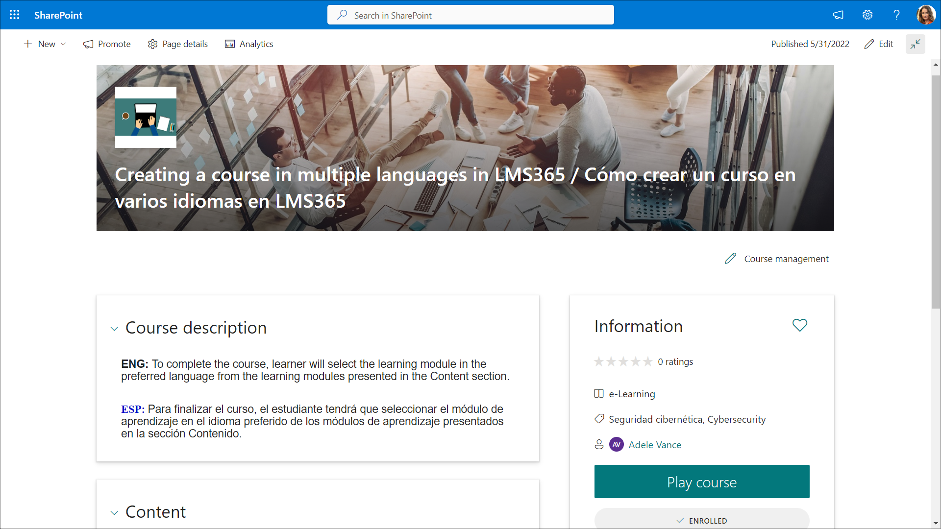 One approach that can be implemented in Learn365 enables you to create a multilingual course that contains the same information in various languages. This course consists of a set of learning modules presented in each of the relevant languages. The main benefit of this approach compared to other approaches is that admins can enroll all learners in a single course. This allows for a centralized approach to learner management and progress tracking. Additionally, learners can select the language in which the course will be presented, directly from the course.
