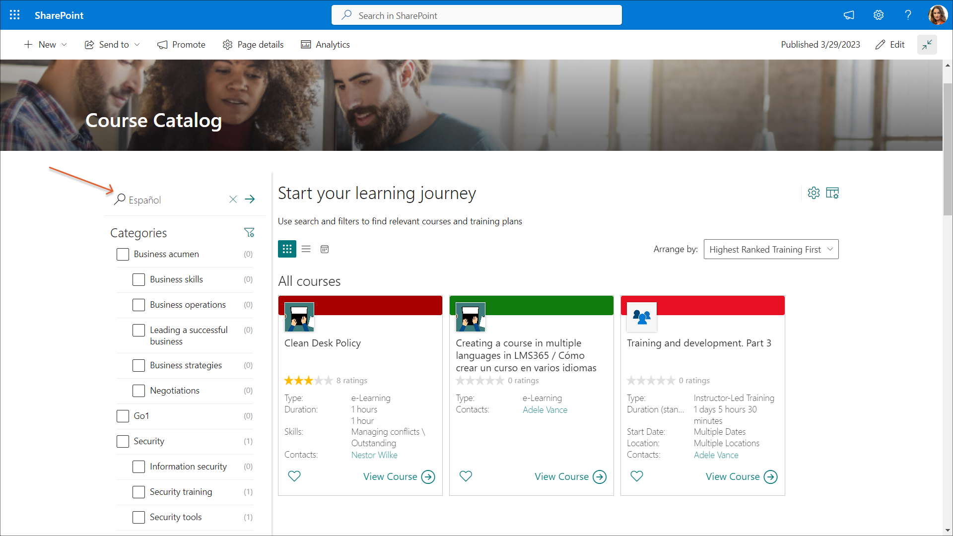 Learners will see the course catalog categories listed on the course catalog page, where they can sort the available training by categories to find the training subject they're interested in, presented in the language of their choice.